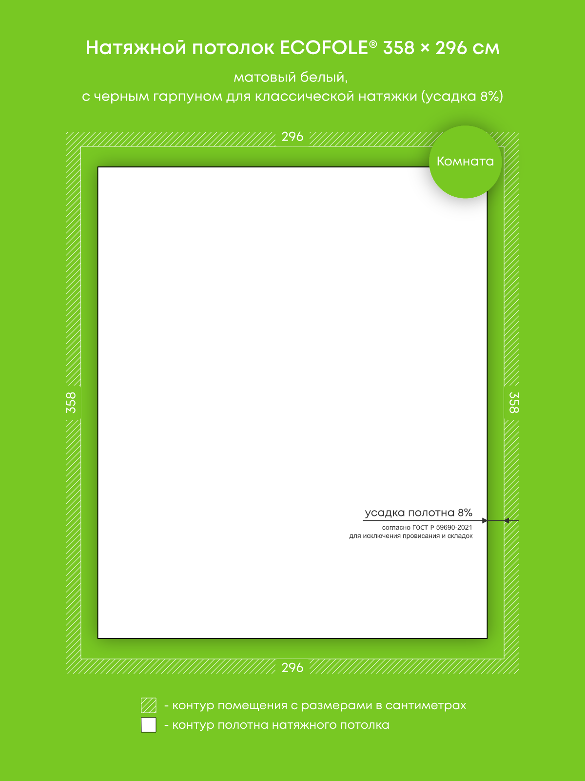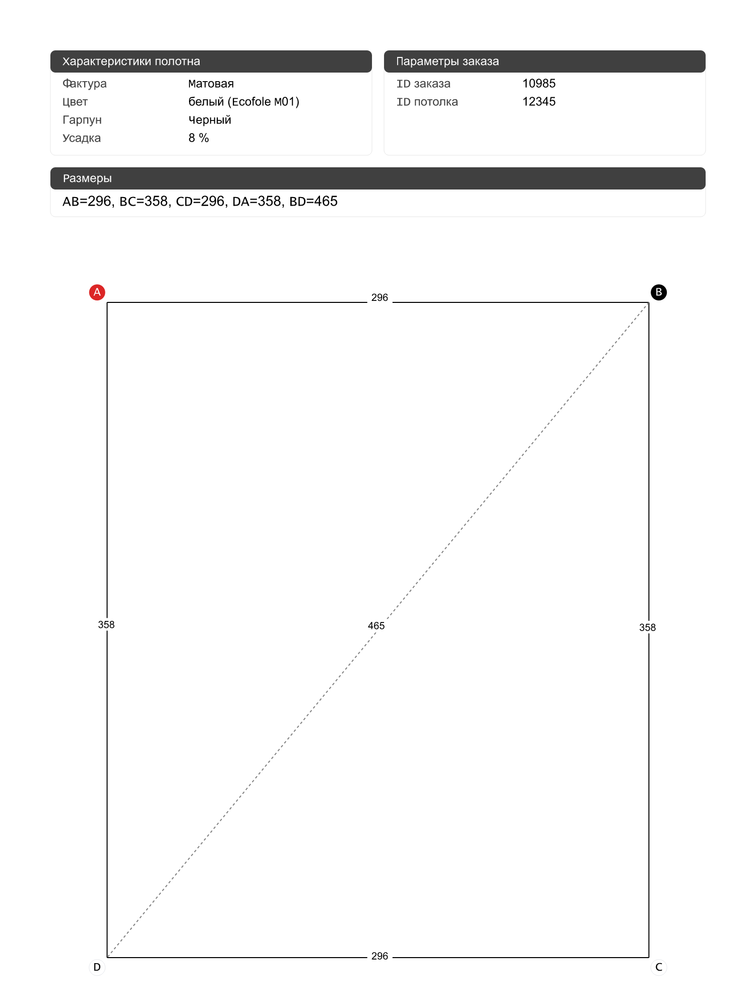 Натяжной потолок белый матовый с черным гарпуном, классической натяжки, изготовленный по индивидуальным размерам покупателя, для помещения площадью 10.6 м2