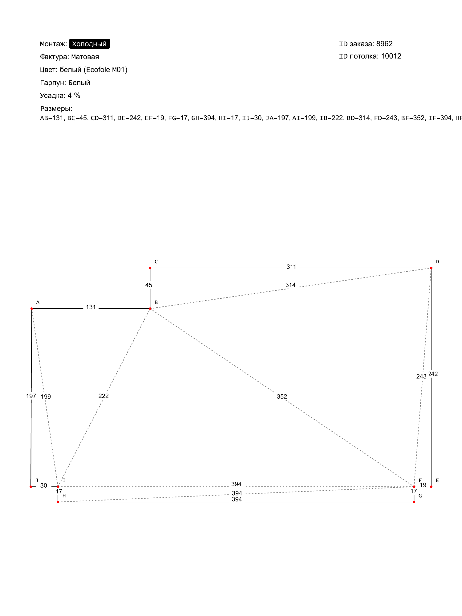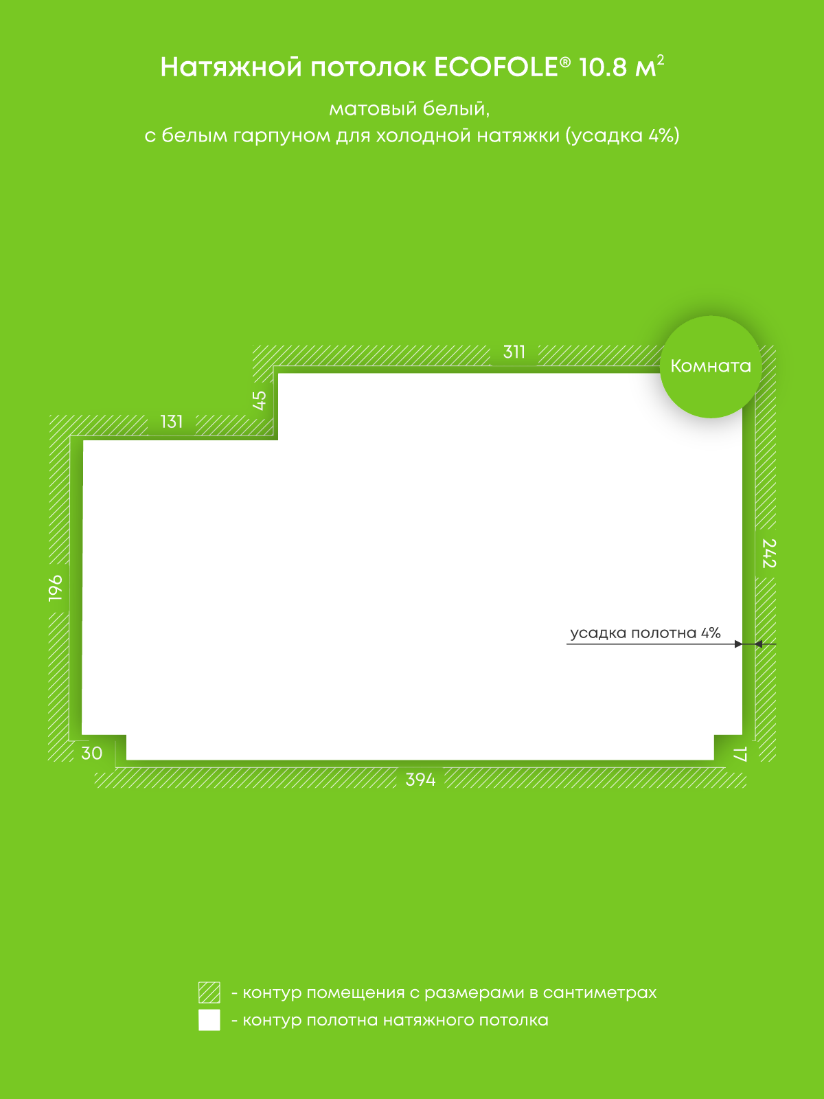 Натяжной потолок белый матовый, холодной натяжки, изготовленный по индивидуальным размерам покупателя, для помещения площадью 10.8 м2