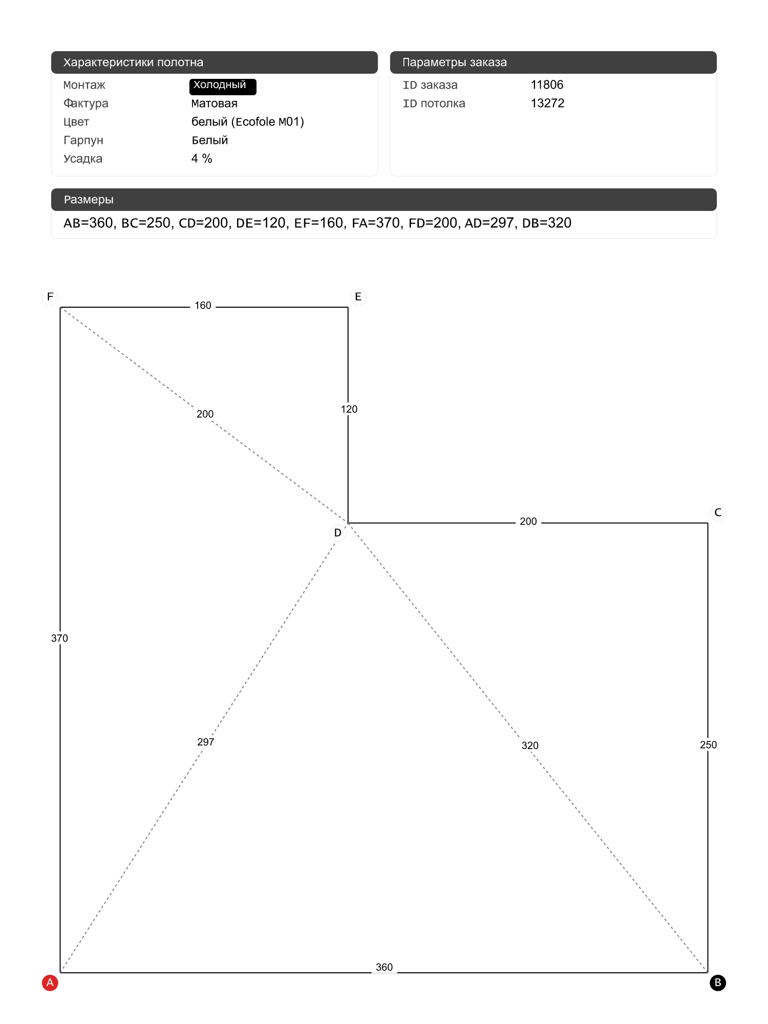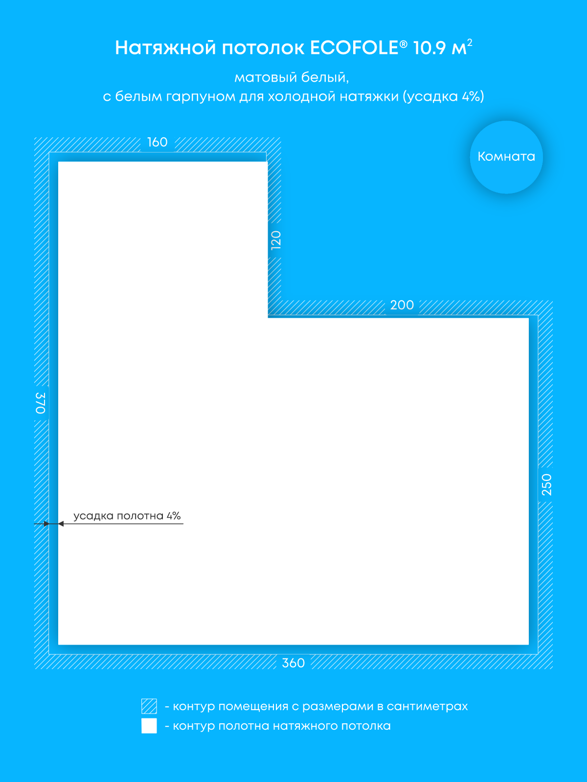 Натяжной потолок белый матовый, холодной натяжки, изготовленный по индивидуальным размерам покупателя, для помещения площадью 10.9 м2