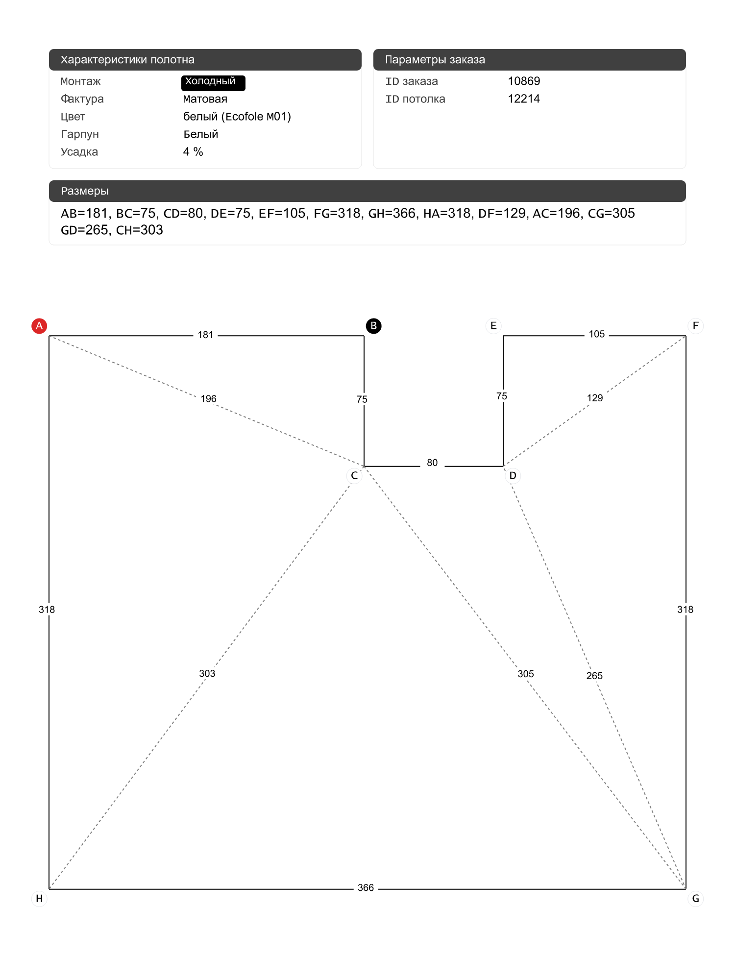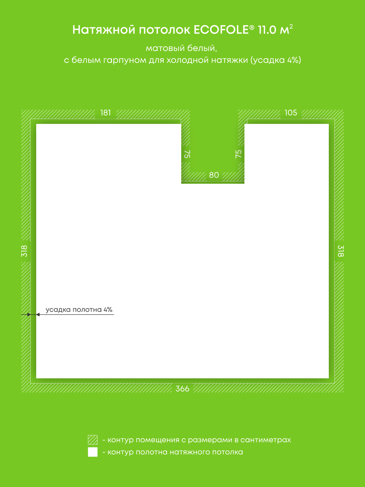 Натяжной потолок белый матовый, холодной натяжки, изготовленный по индивидуальным размерам покупателя, для помещения площадью 11 м2