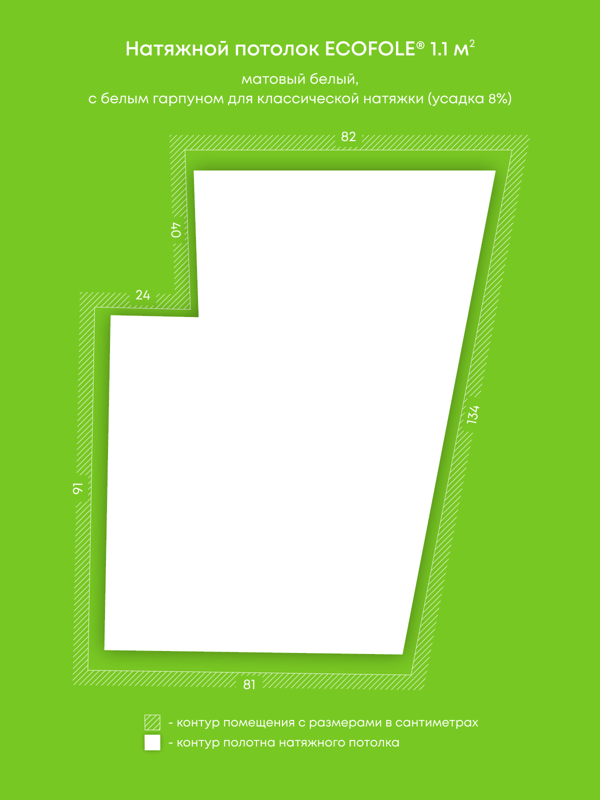 Натяжной потолок белый матовый, изготовленный по индивидуальным размерам покупателя, для помещения площадью 1.1 м2
