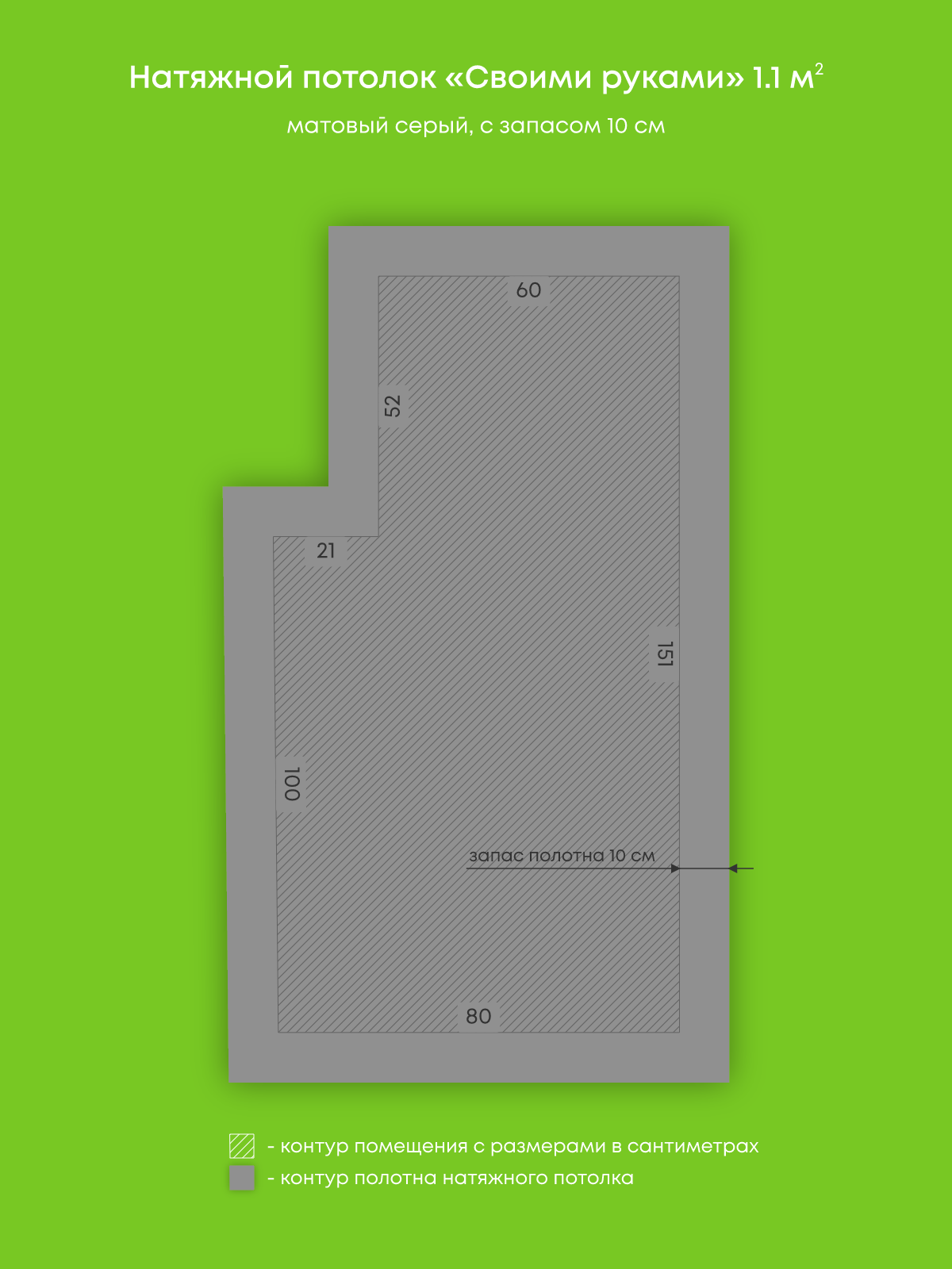 Натяжной потолок серый матовый, изготовленный по индивидуальным размерам покупателя, для ванной площадью 1.1 м2