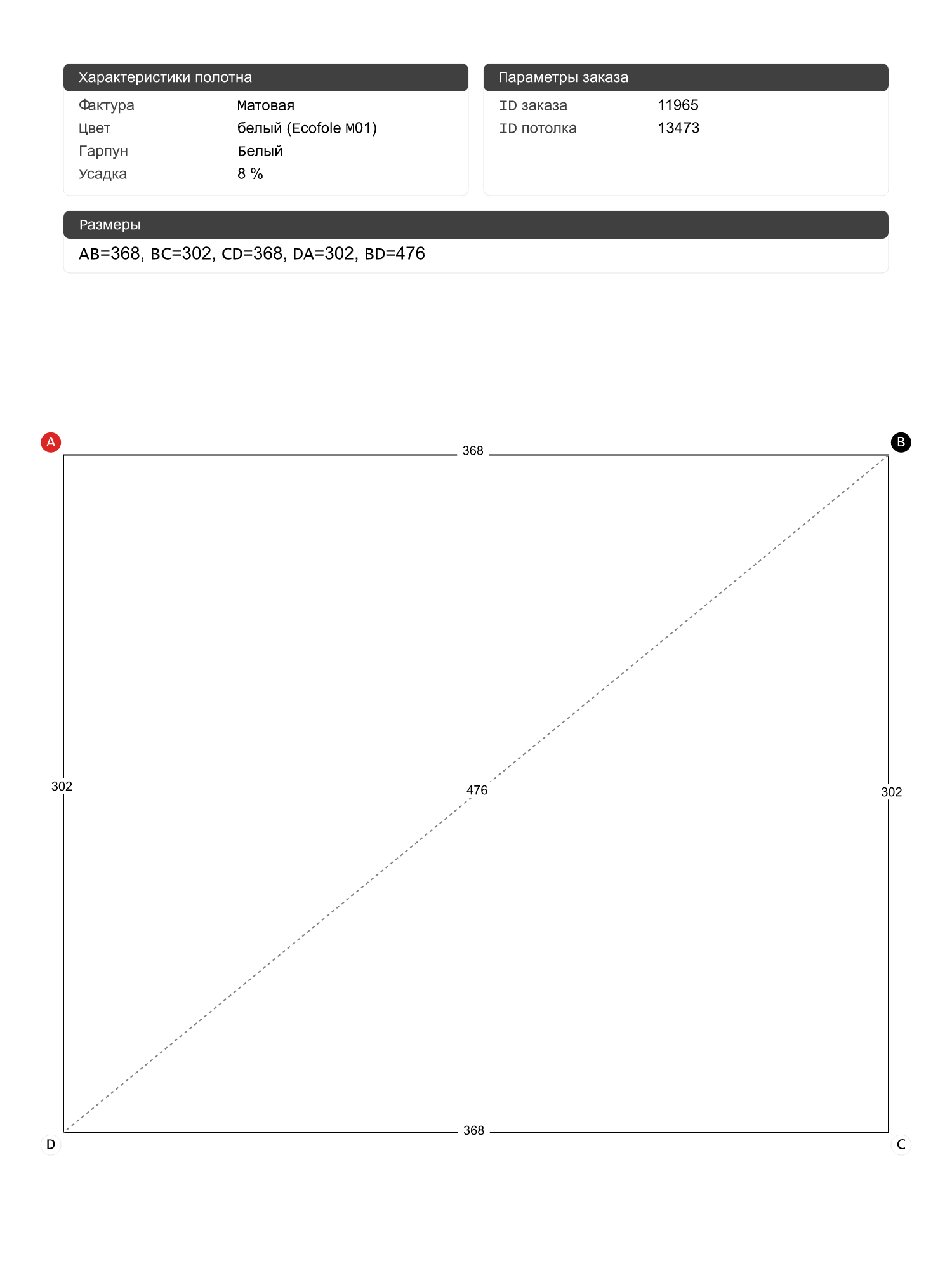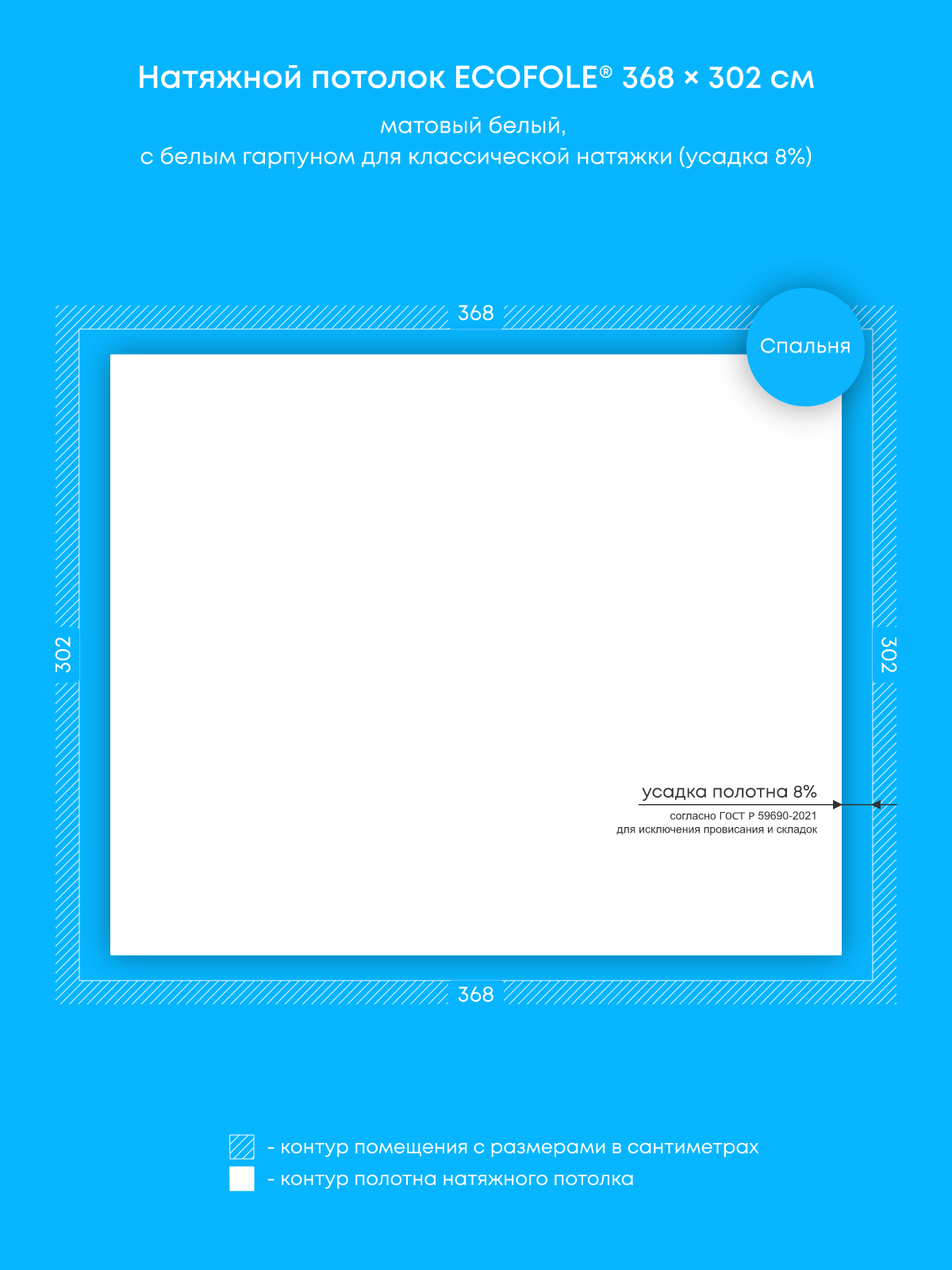 Натяжной потолок белый матовый, классической натяжки, изготовленный по индивидуальным размерам покупателя, для помещения площадью 11.1 м2