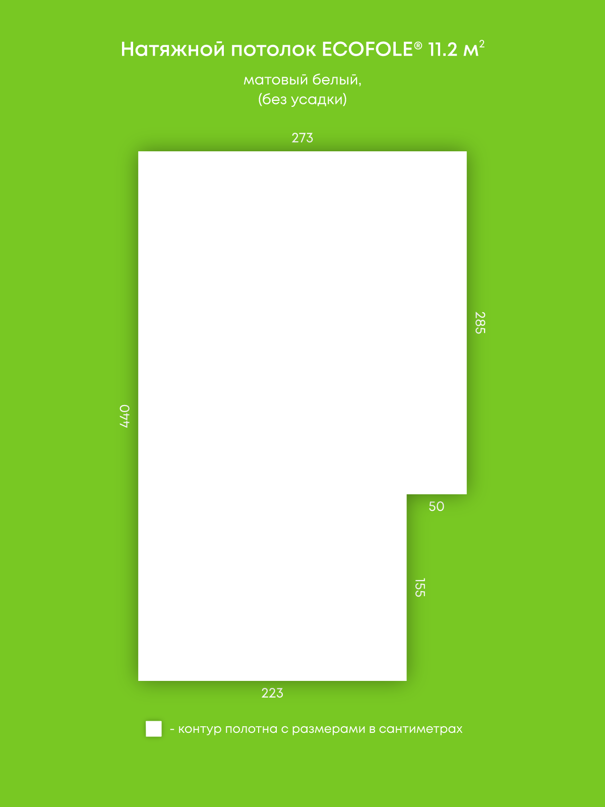 Натяжной потолок белый матовый, изготовленный по индивидуальным размерам покупателя, для помещения площадью 11.2 м2