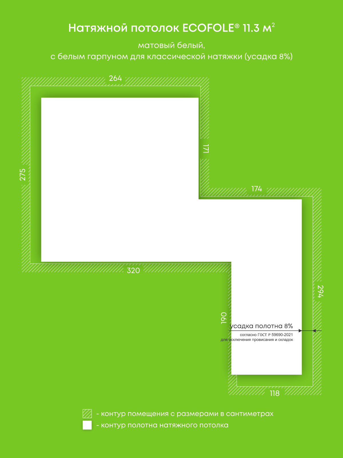 Натяжной потолок белый матовый, изготовленный по индивидуальным размерам покупателя, для помещения площадью 11.3 м2