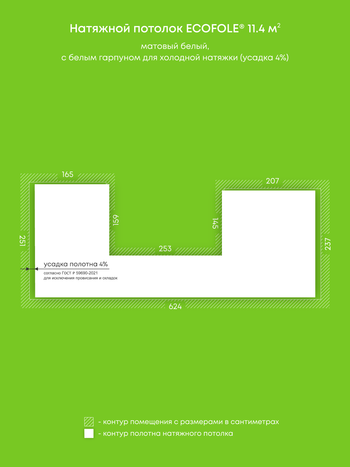 Натяжной потолок белый матовый, изготовленный по индивидуальным размерам покупателя, для гостиной площадью 11.4 м2