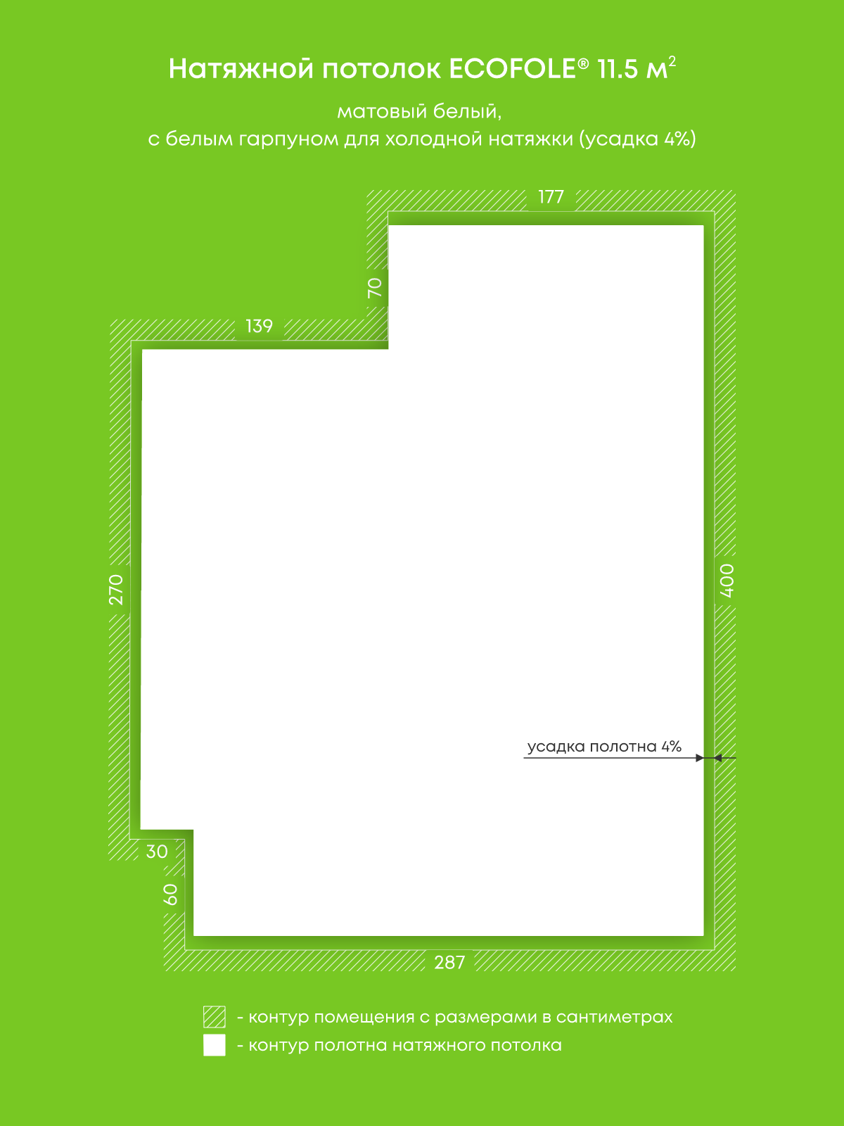 Натяжной потолок белый матовый, изготовленный по индивидуальным размерам покупателя, для помещения площадью 11.5 м2