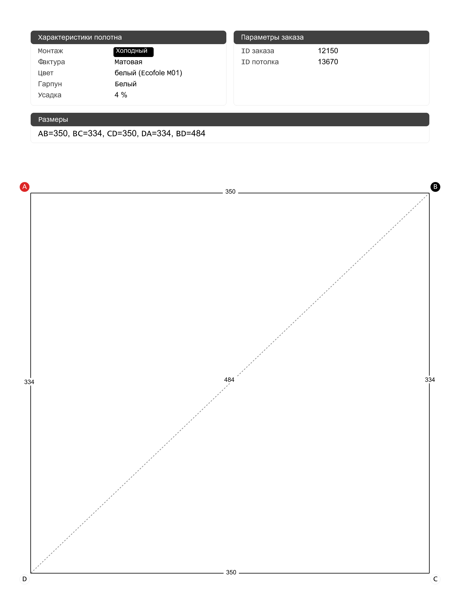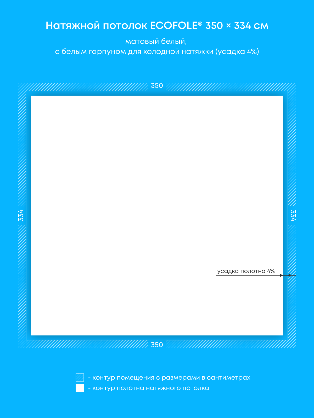 Натяжной потолок белый матовый, холодной натяжки, изготовленный по индивидуальным размерам покупателя, для помещения площадью 11.7 м2