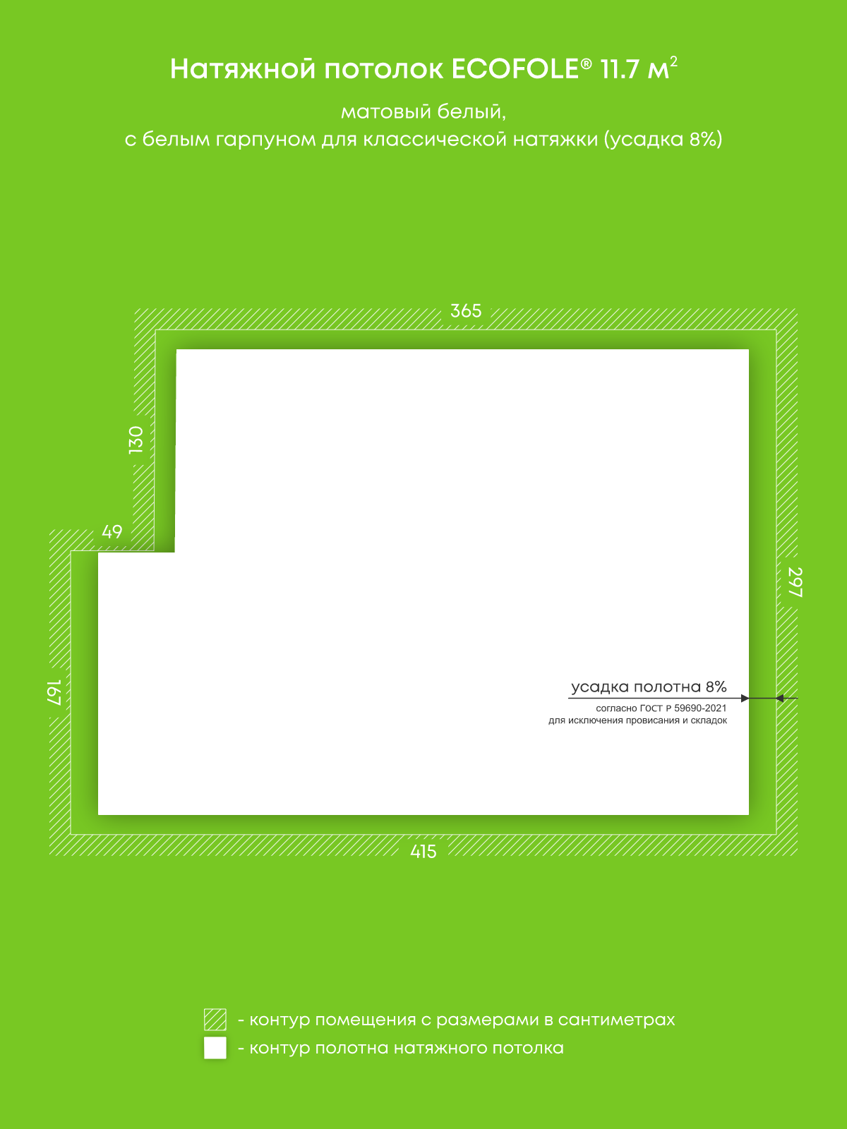 Натяжной потолок белый матовый, изготовленный по индивидуальным размерам покупателя, для спальни площадью 11.7 м2