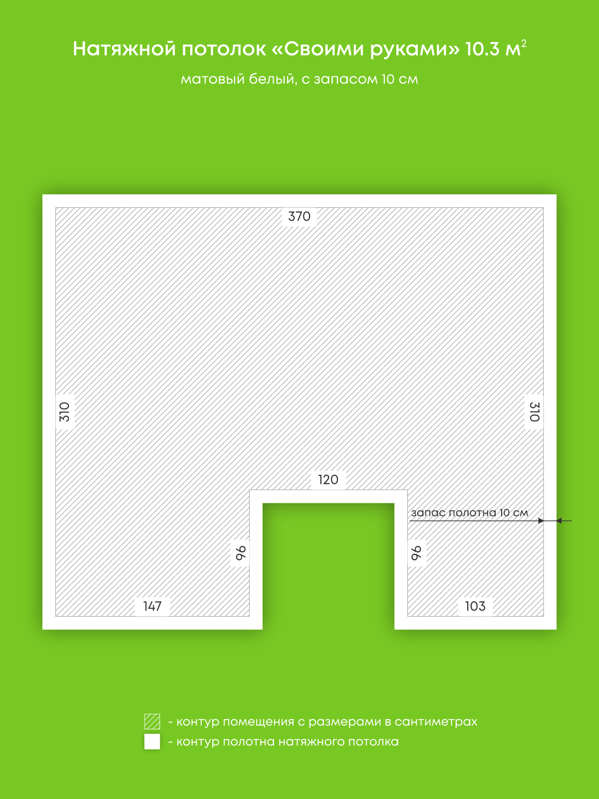 Натяжной потолок белый матовый, изготовленный по индивидуальным размерам покупателя, для помещения площадью 11.9 м2