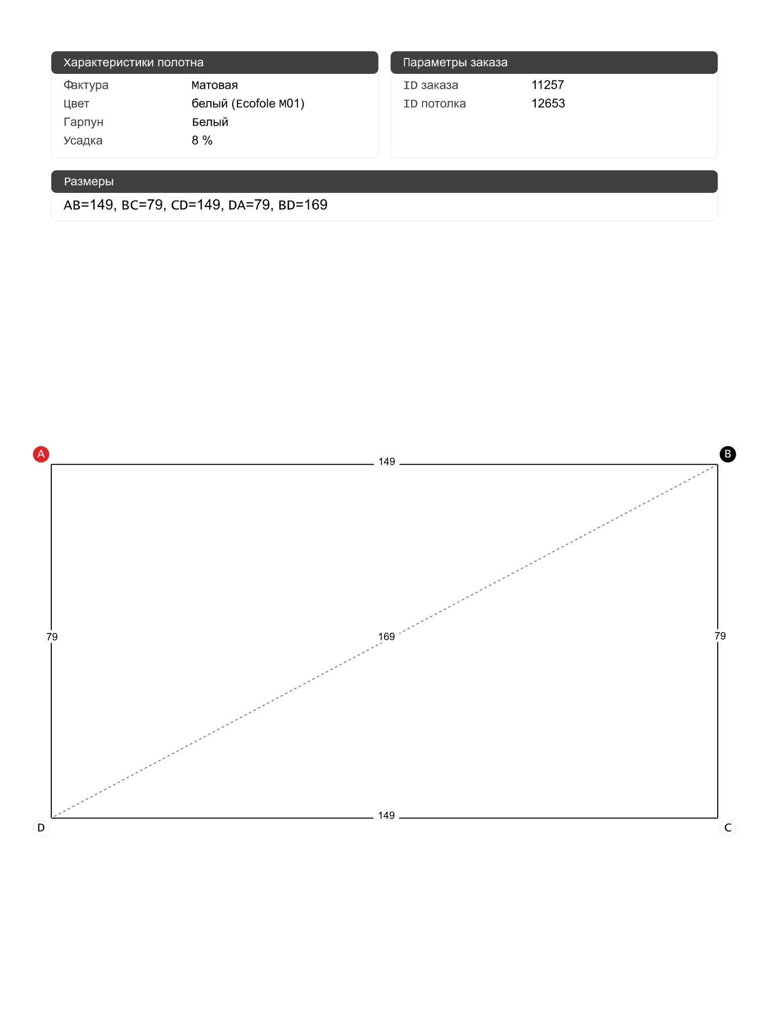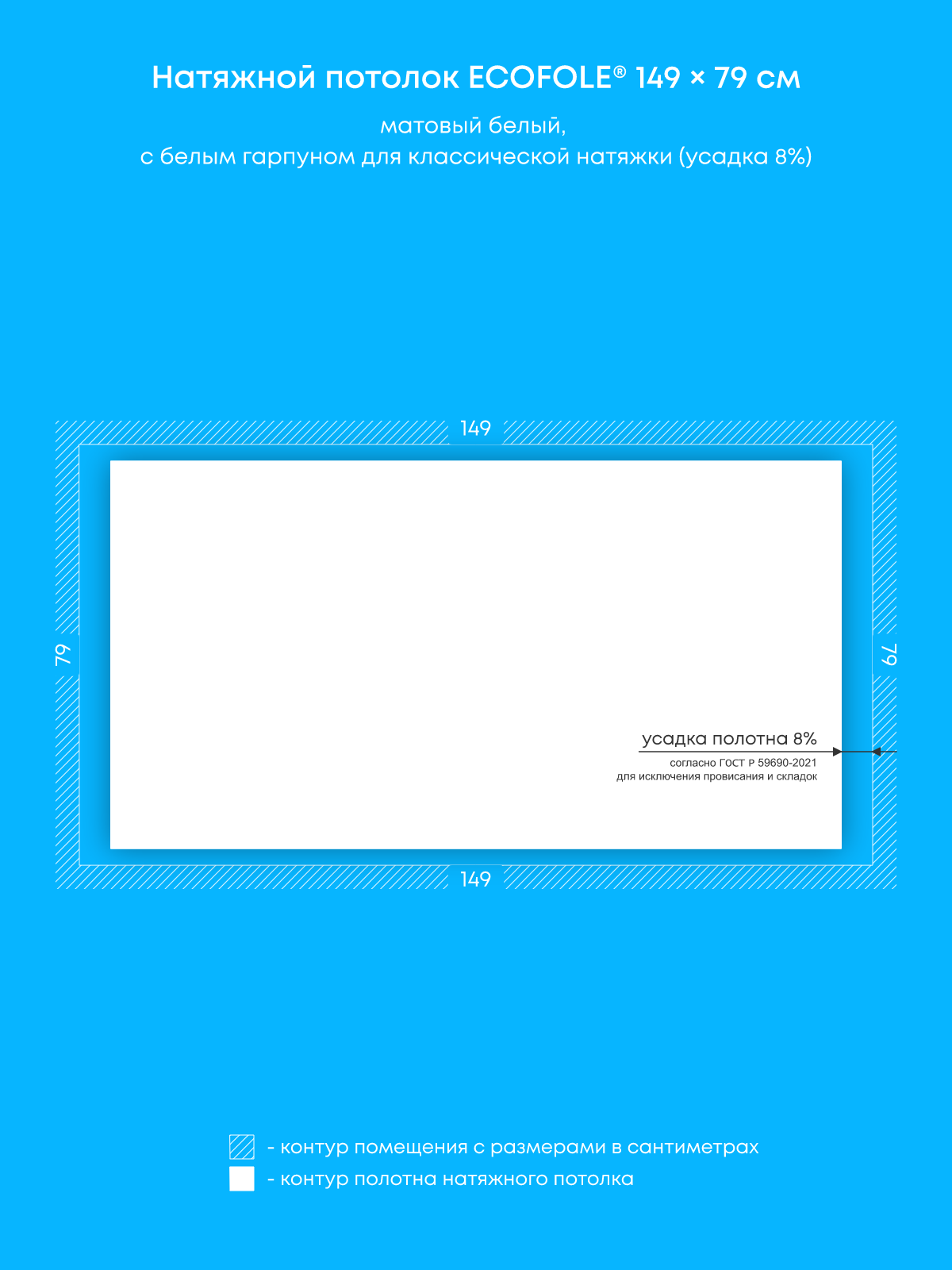 Натяжной потолок белый матовый, классической натяжки, изготовленный по индивидуальным размерам покупателя, для помещения площадью 1.2 м2