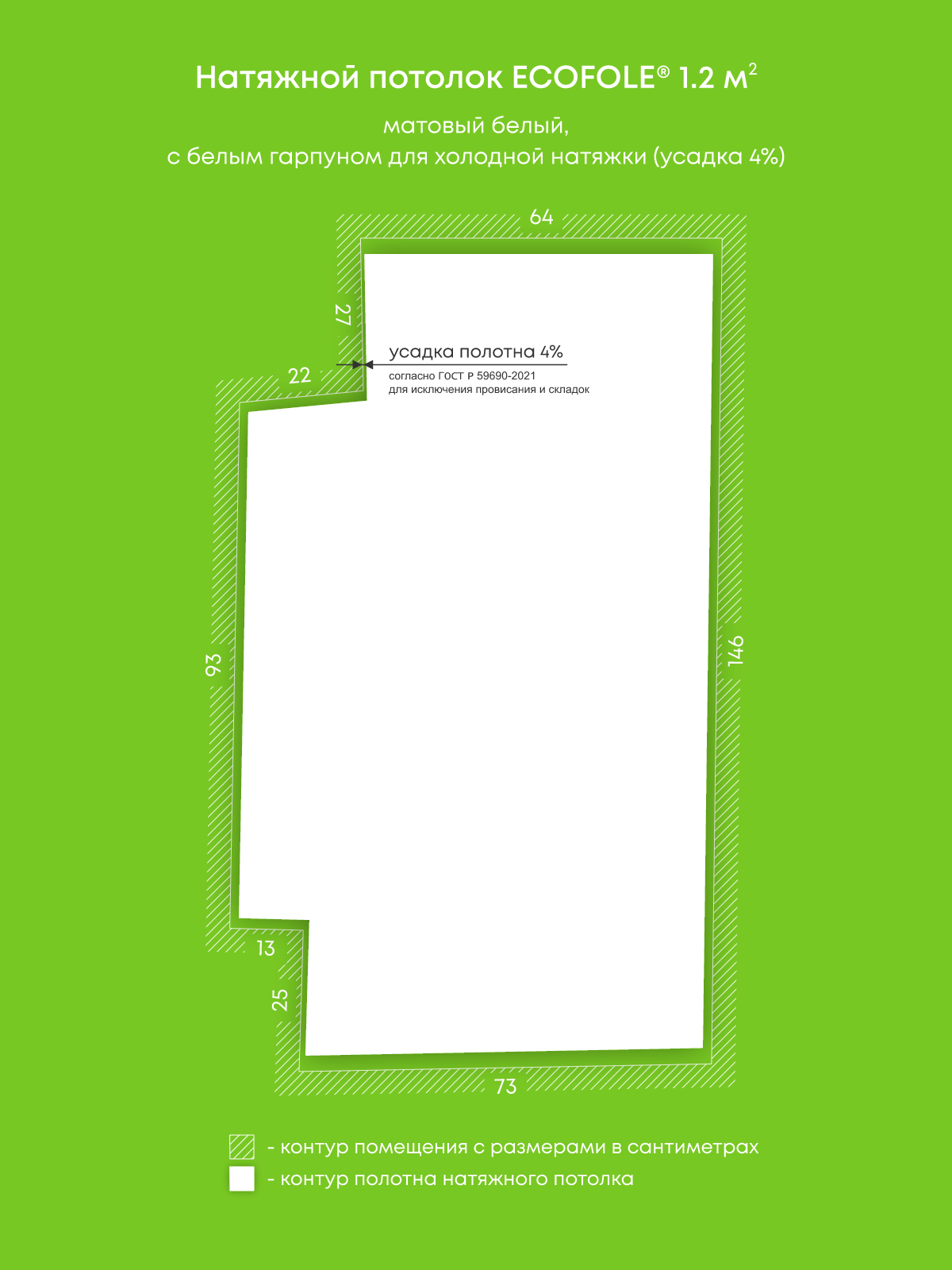 Натяжной потолок белый матовый, изготовленный по индивидуальным размерам покупателя, для помещения площадью 1.2 м2