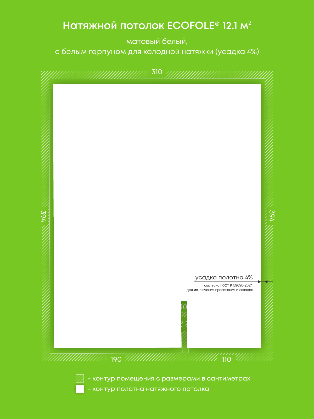 Натяжной потолок белый матовый, изготовленный по индивидуальным размерам покупателя, для комнаты площадью 12.1 м2