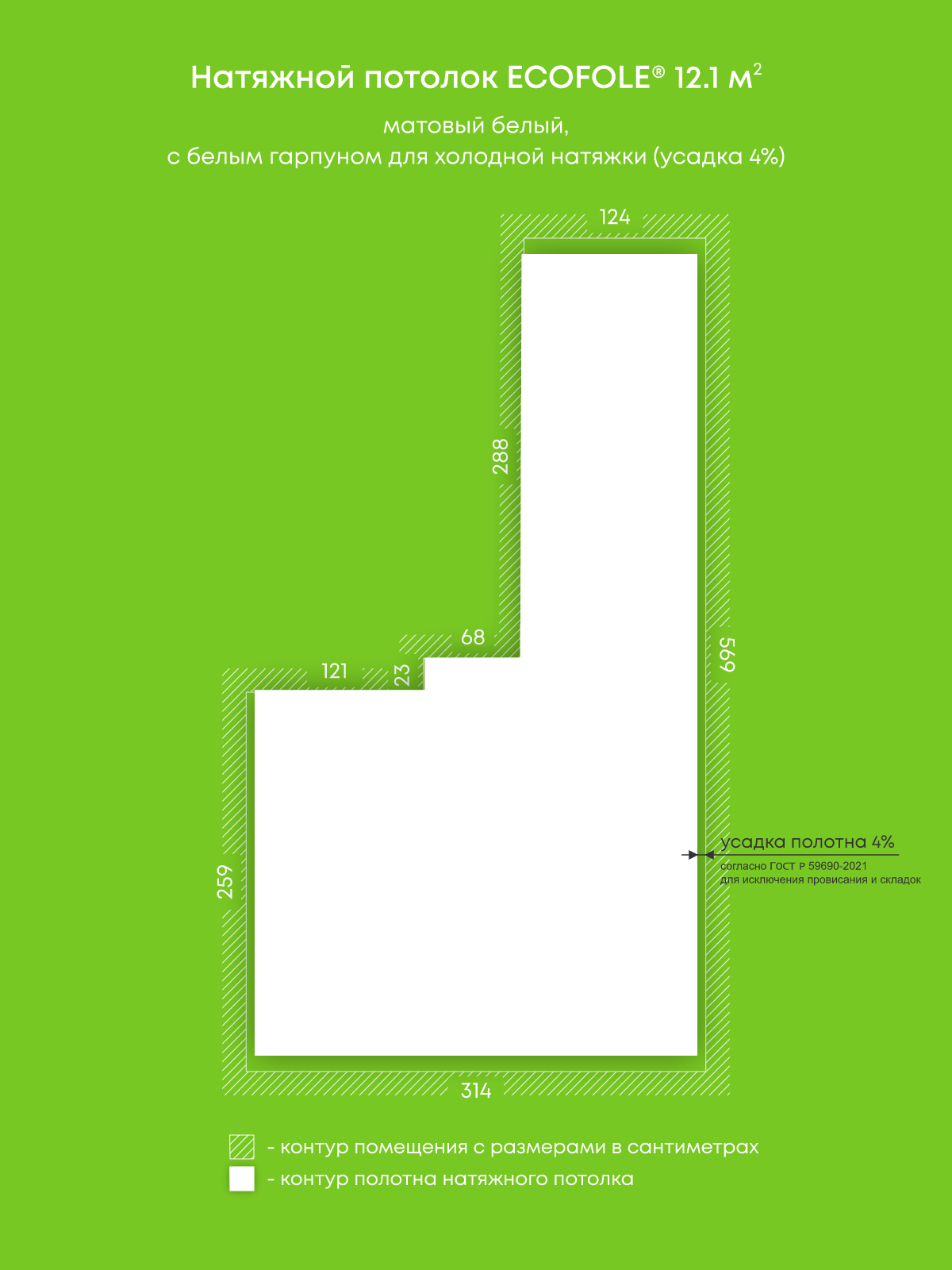 Натяжной потолок белый матовый, изготовленный по индивидуальным размерам покупателя, для комнаты площадью 12.1 м2