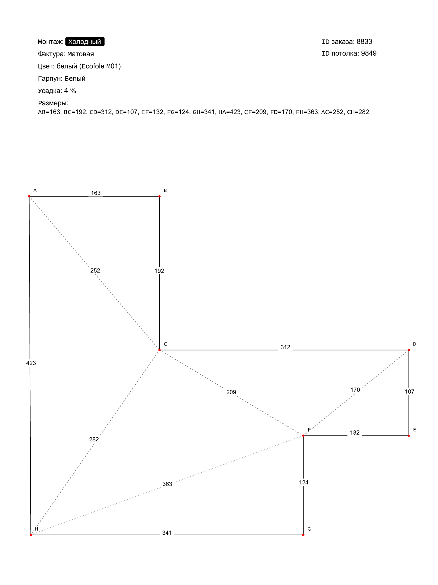 Натяжной потолок белый матовый, холодной натяжки, изготовленный по индивидуальным размерам покупателя, для помещения площадью 12.4 м2