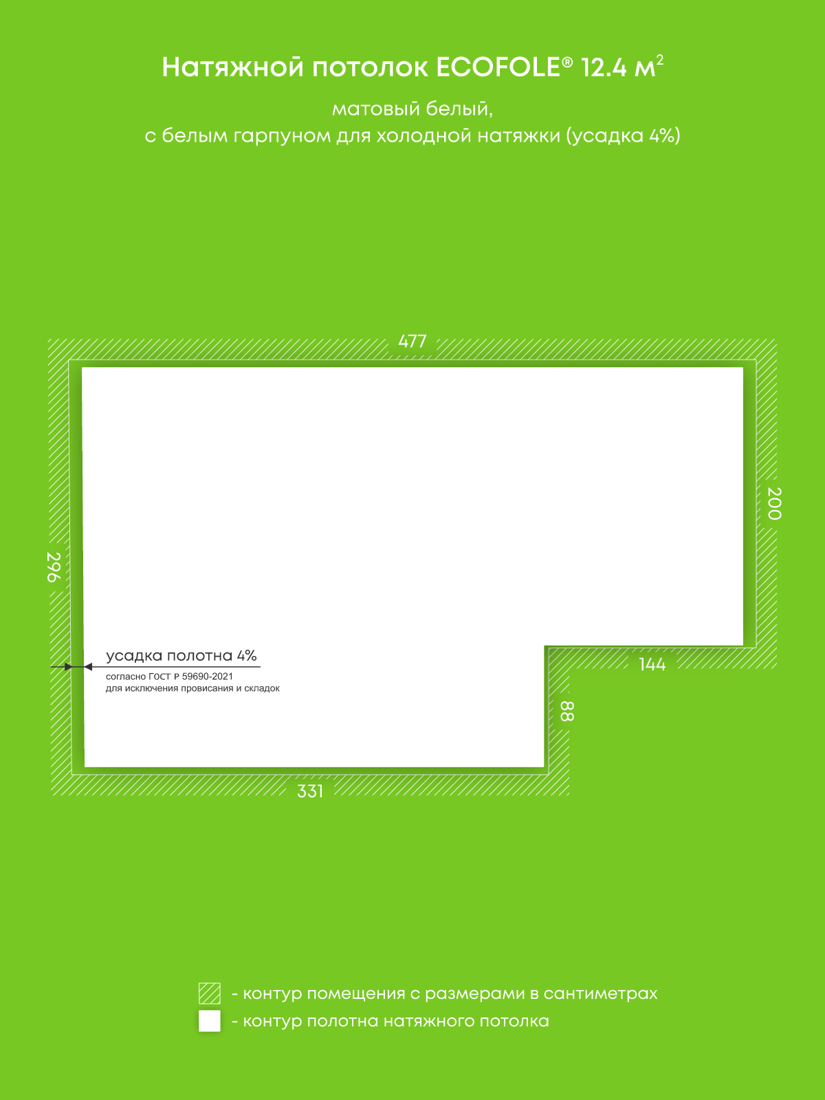 Натяжной потолок белый матовый, изготовленный по индивидуальным размерам покупателя, для комнаты площадью 12.4 м2