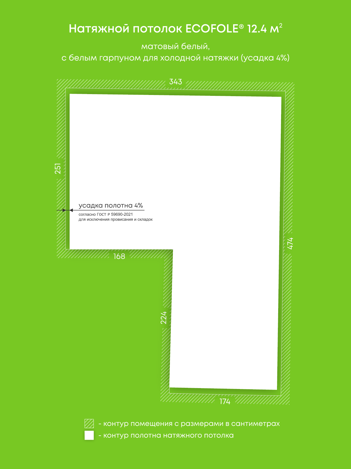 Натяжной потолок белый матовый, изготовленный по индивидуальным размерам покупателя, для комнаты площадью 12.4 м2