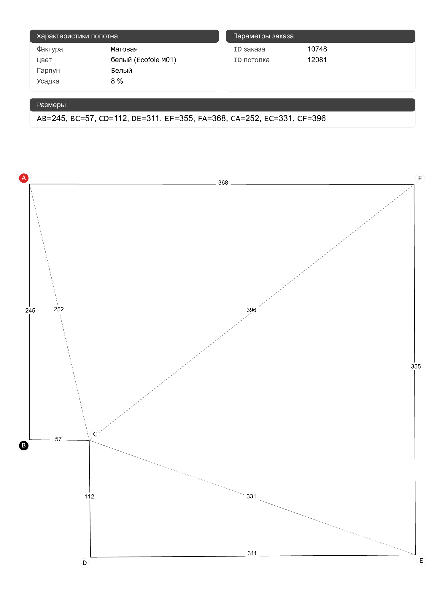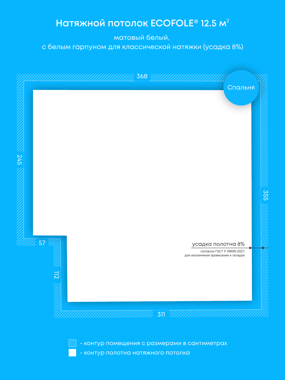 Натяжной потолок белый матовый, классической натяжки, изготовленный по индивидуальным размерам покупателя, для помещения площадью 12.5 м2