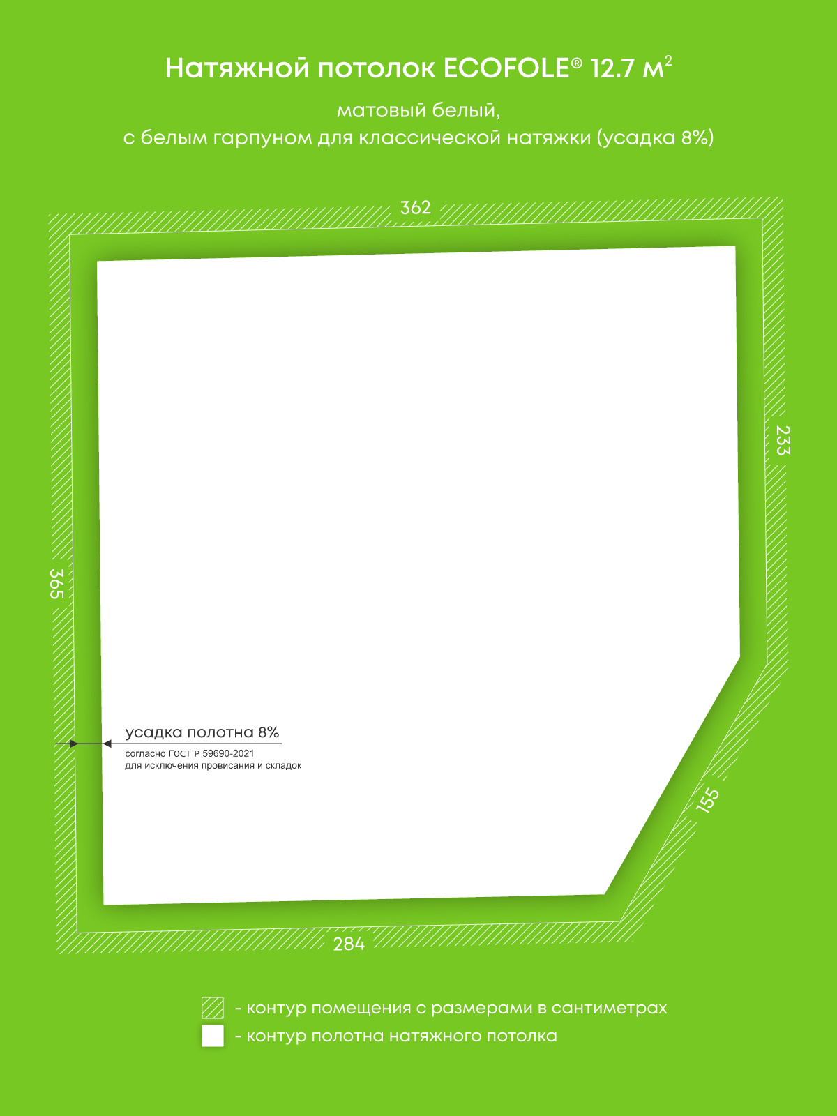 Натяжной потолок белый матовый, изготовленный по индивидуальным размерам покупателя, для комнаты площадью 12.7 м2