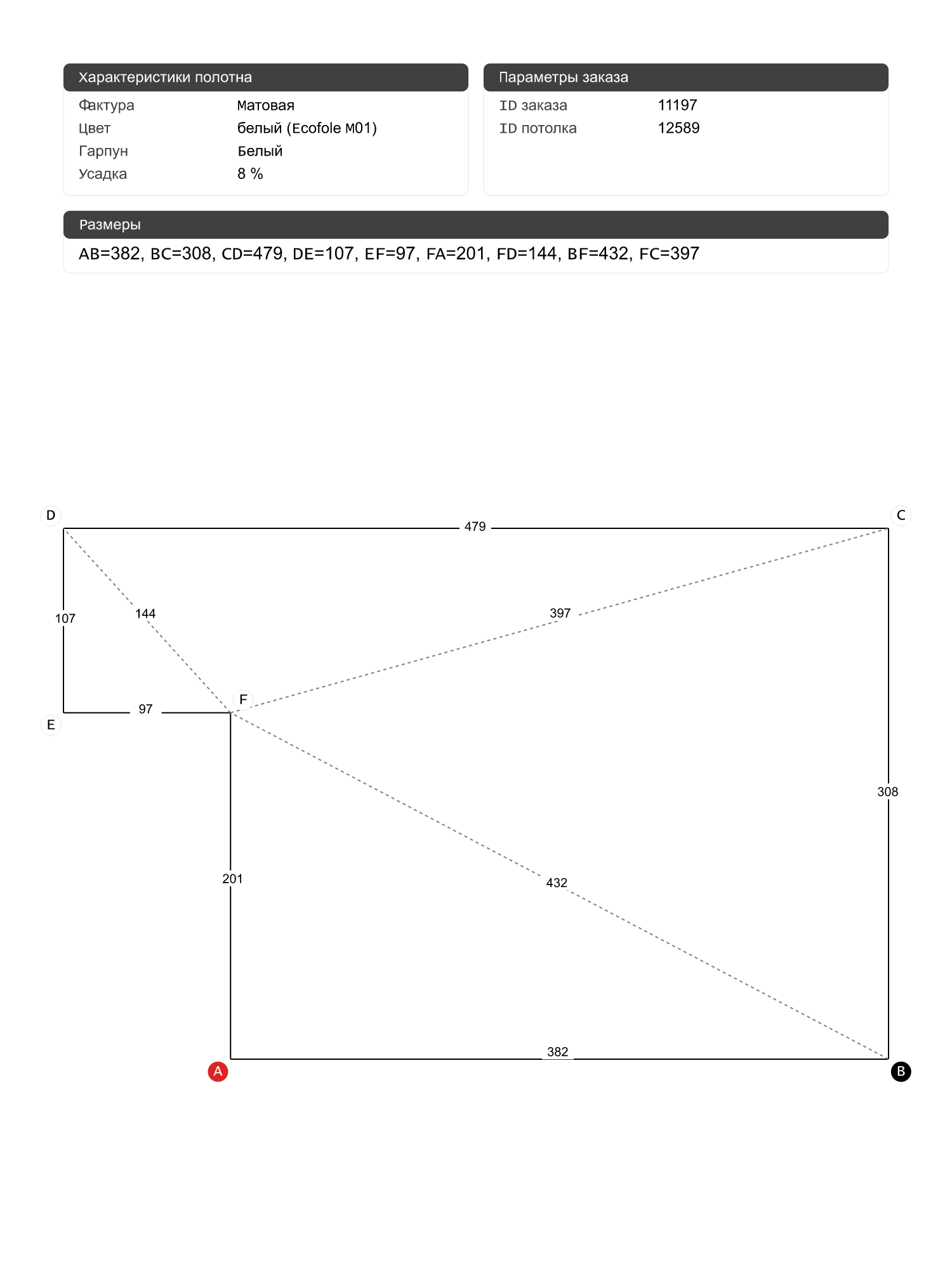 Натяжной потолок белый матовый, классической натяжки, изготовленный по индивидуальным размерам покупателя, для помещения площадью 12.8 м2