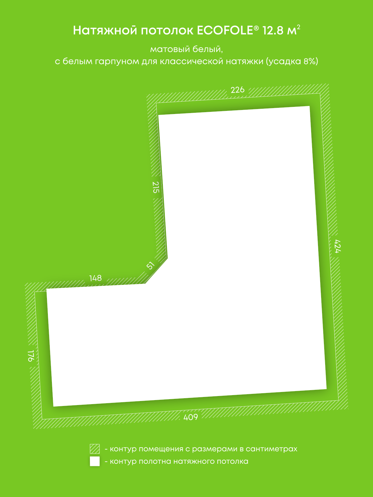 Натяжной потолок белый матовый, изготовленный по индивидуальным размерам покупателя, для гостиной площадью 12.8 м2
