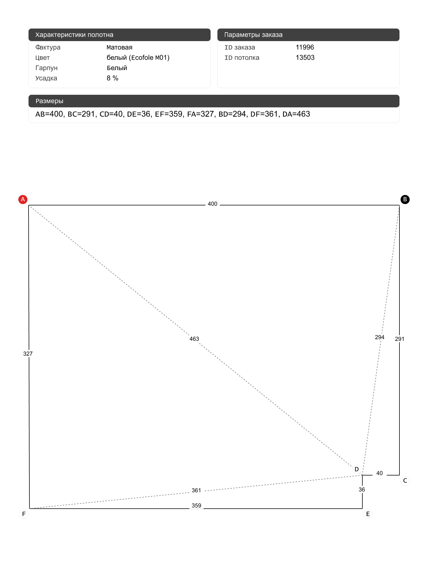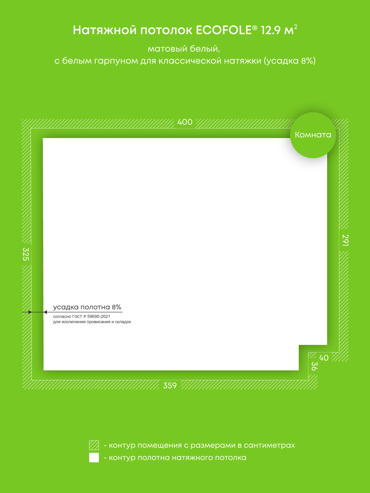 Натяжной потолок белый матовый, классической натяжки, изготовленный по индивидуальным размерам покупателя, для помещения площадью 12.9 м2