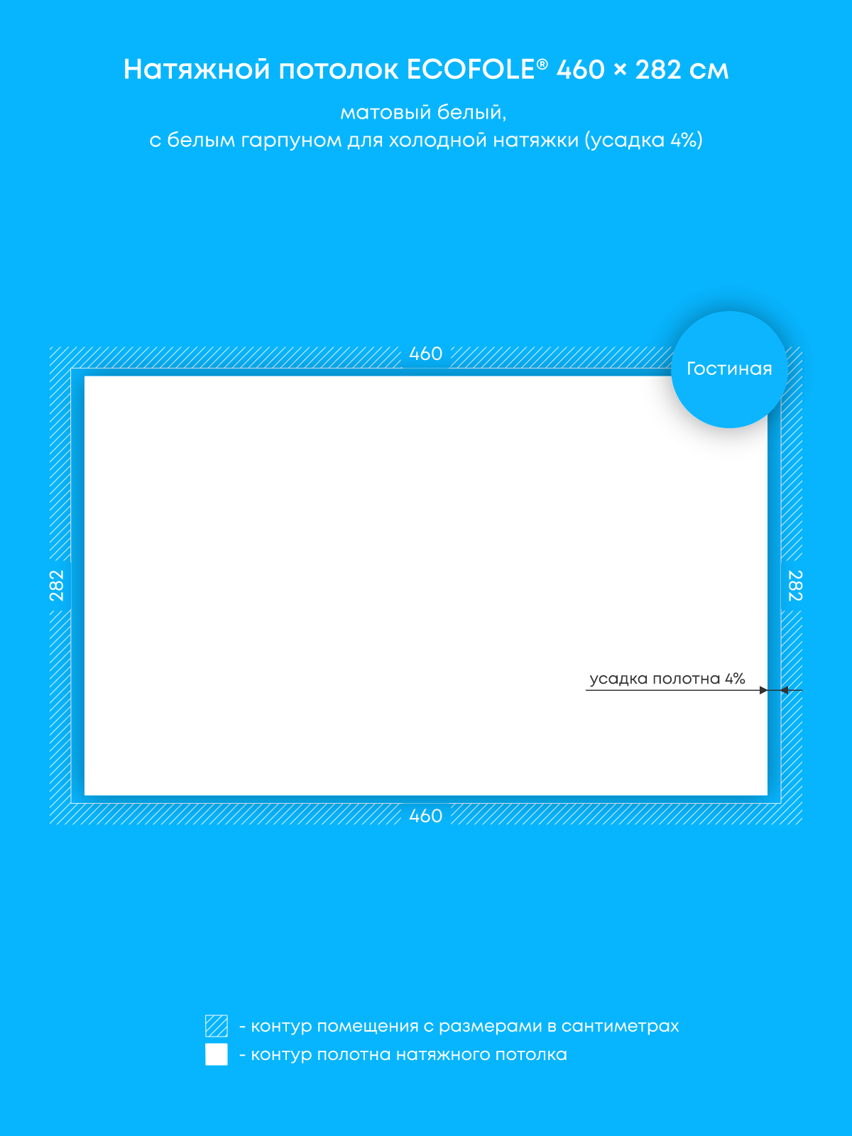 Натяжной потолок белый матовый, изготовленный по индивидуальным размерам покупателя, для гостиной площадью 13 м2