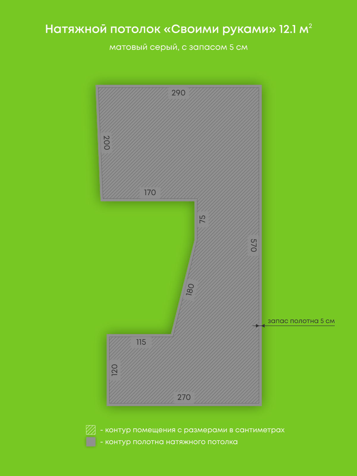 Натяжной потолок серый матовый, изготовленный по индивидуальным размерам покупателя, для помещения площадью 13.1 м2