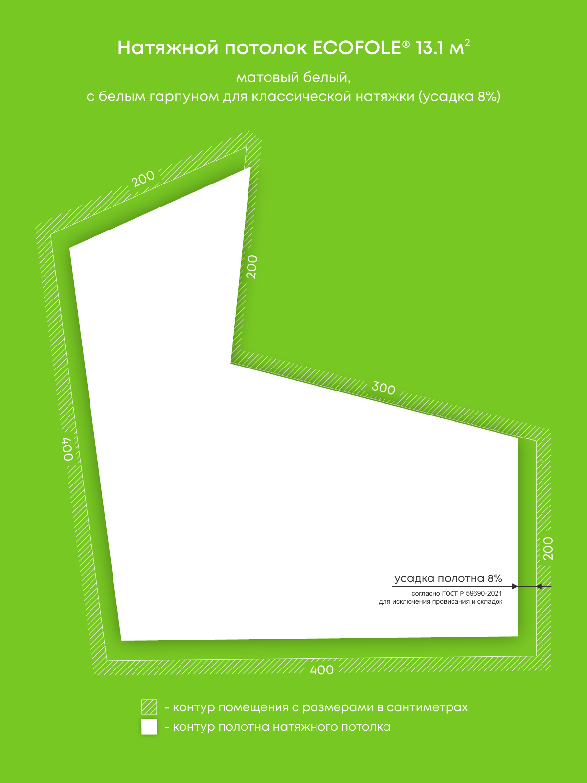 Натяжной потолок белый матовый, изготовленный по индивидуальным размерам покупателя, для гостиной площадью 13.1 м2