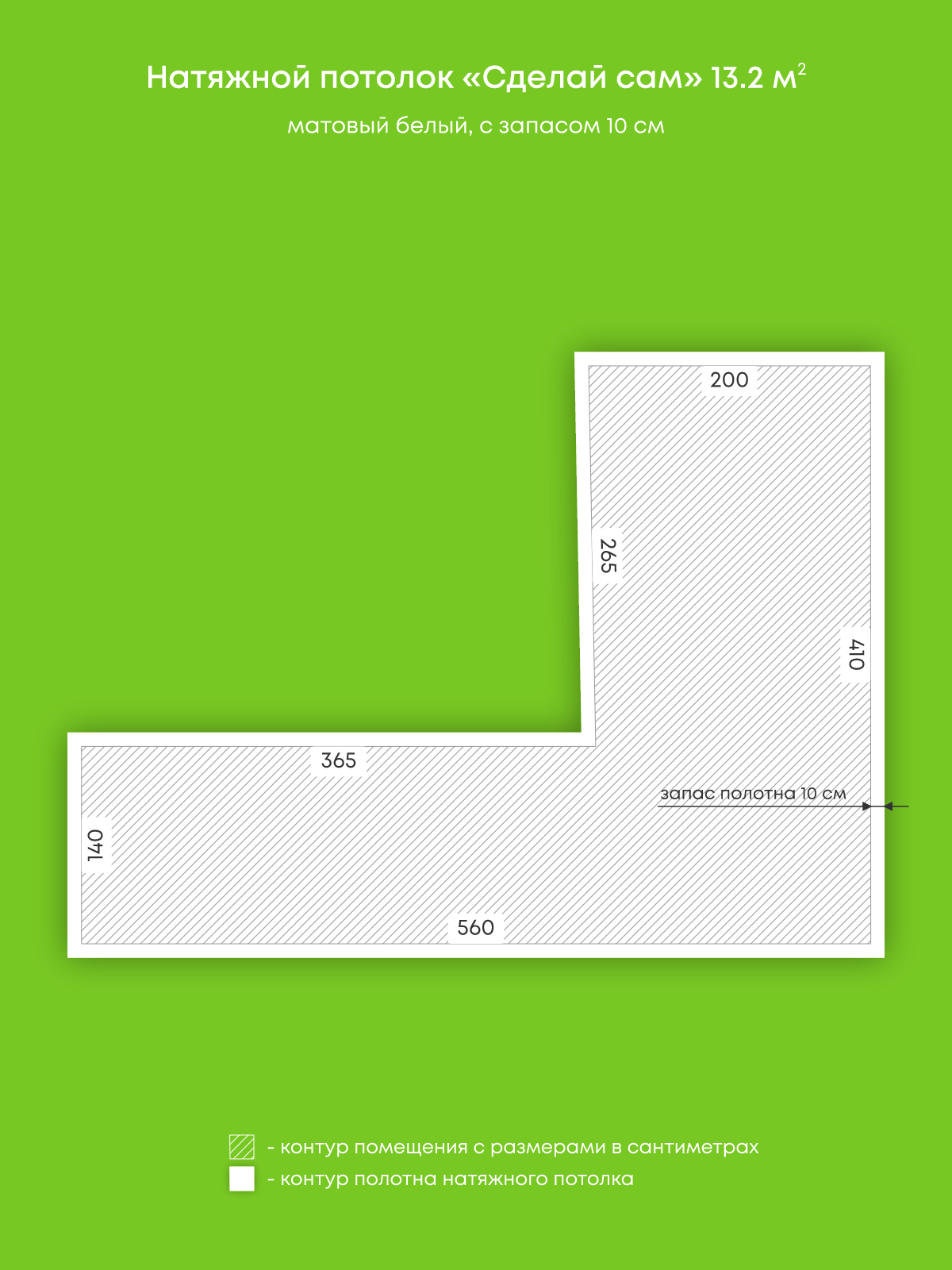 Натяжной потолок белый матовый, изготовленный по индивидуальным размерам покупателя, для помещения площадью 13.2 м2