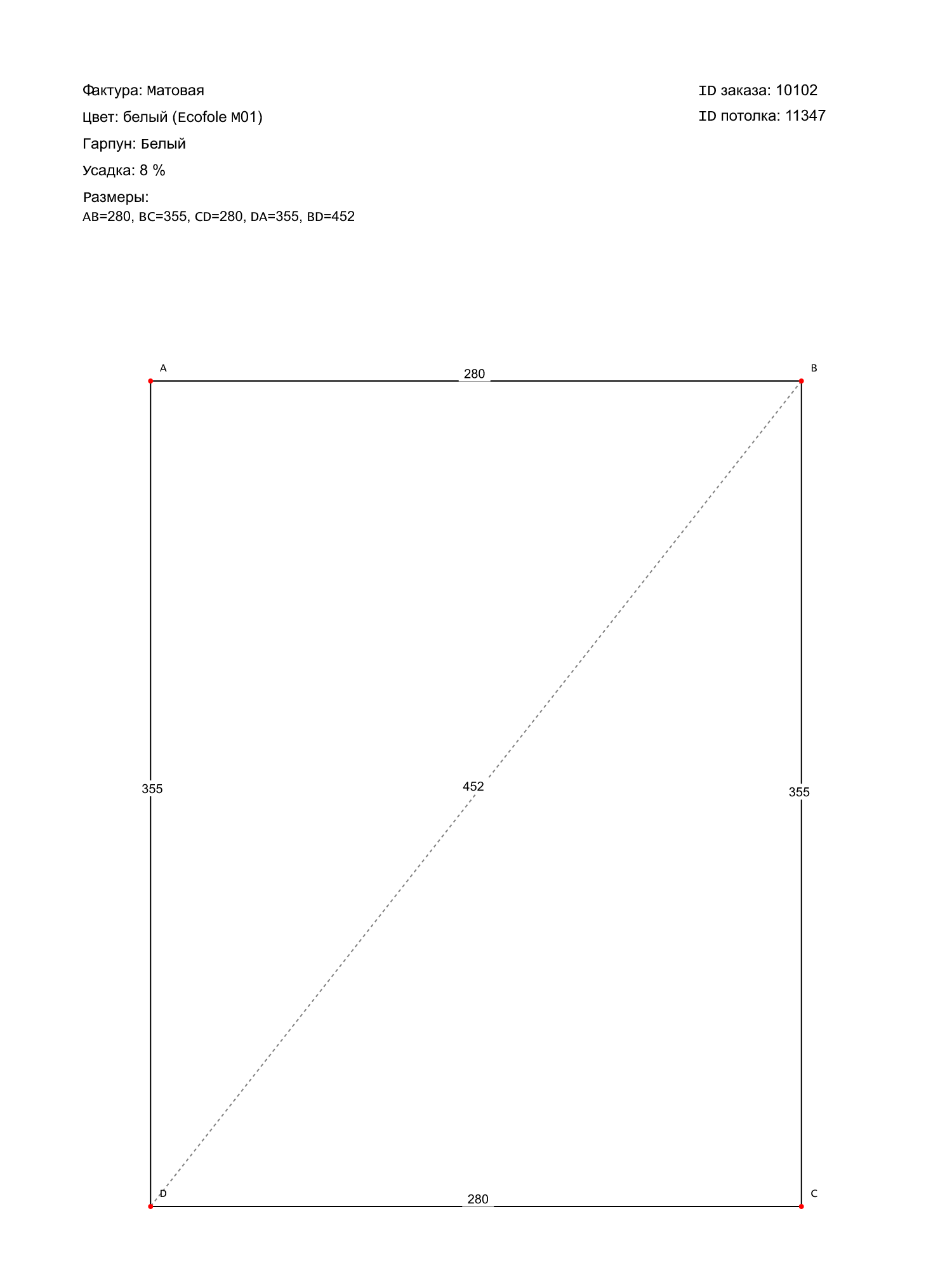 Натяжной потолок белый матовый, классической натяжки, изготовленный по индивидуальным размерам покупателя, для помещения площадью 13.6 м2