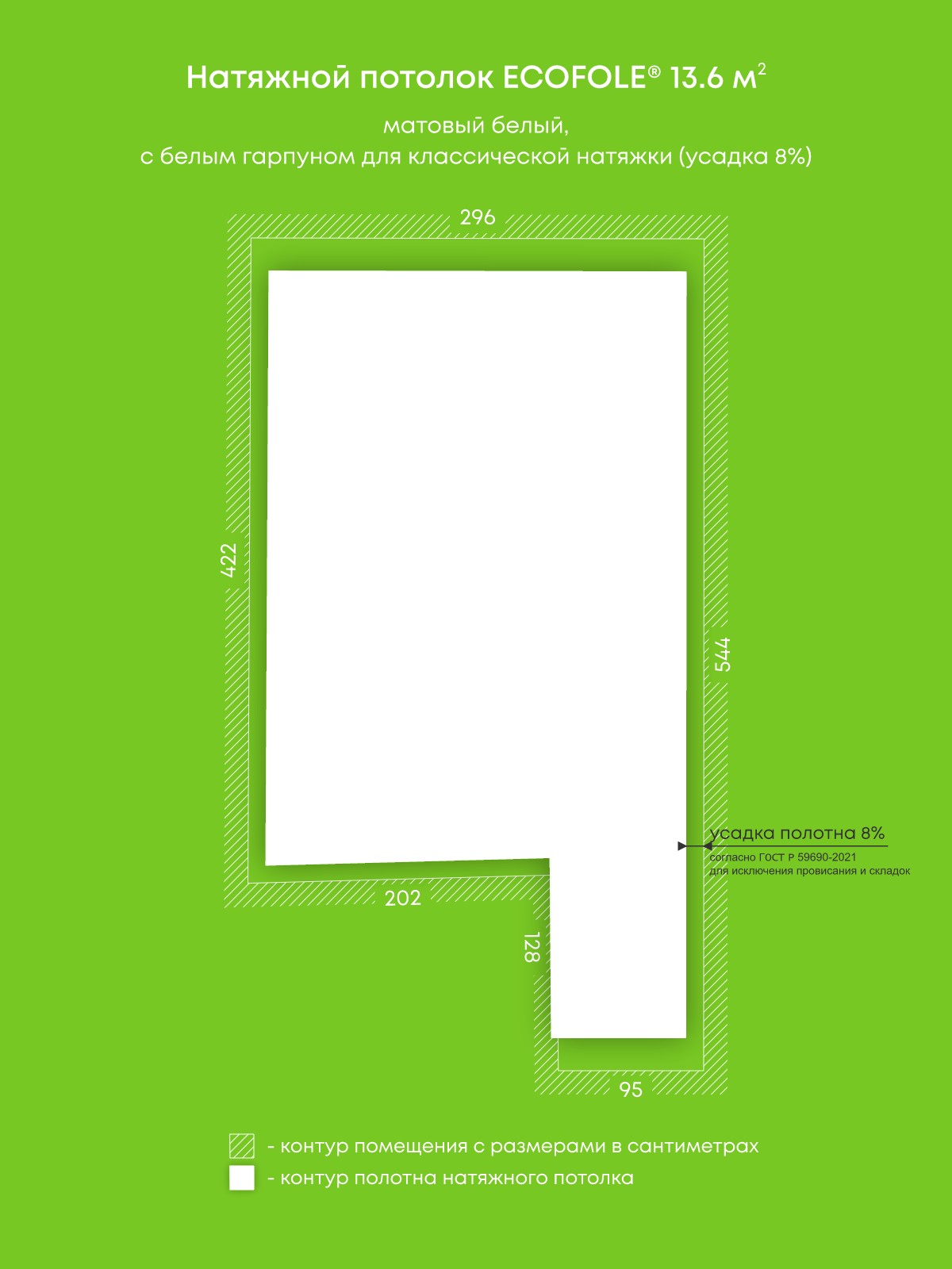 Натяжной потолок белый матовый, изготовленный по индивидуальным размерам покупателя, для помещения площадью 13.6 м2