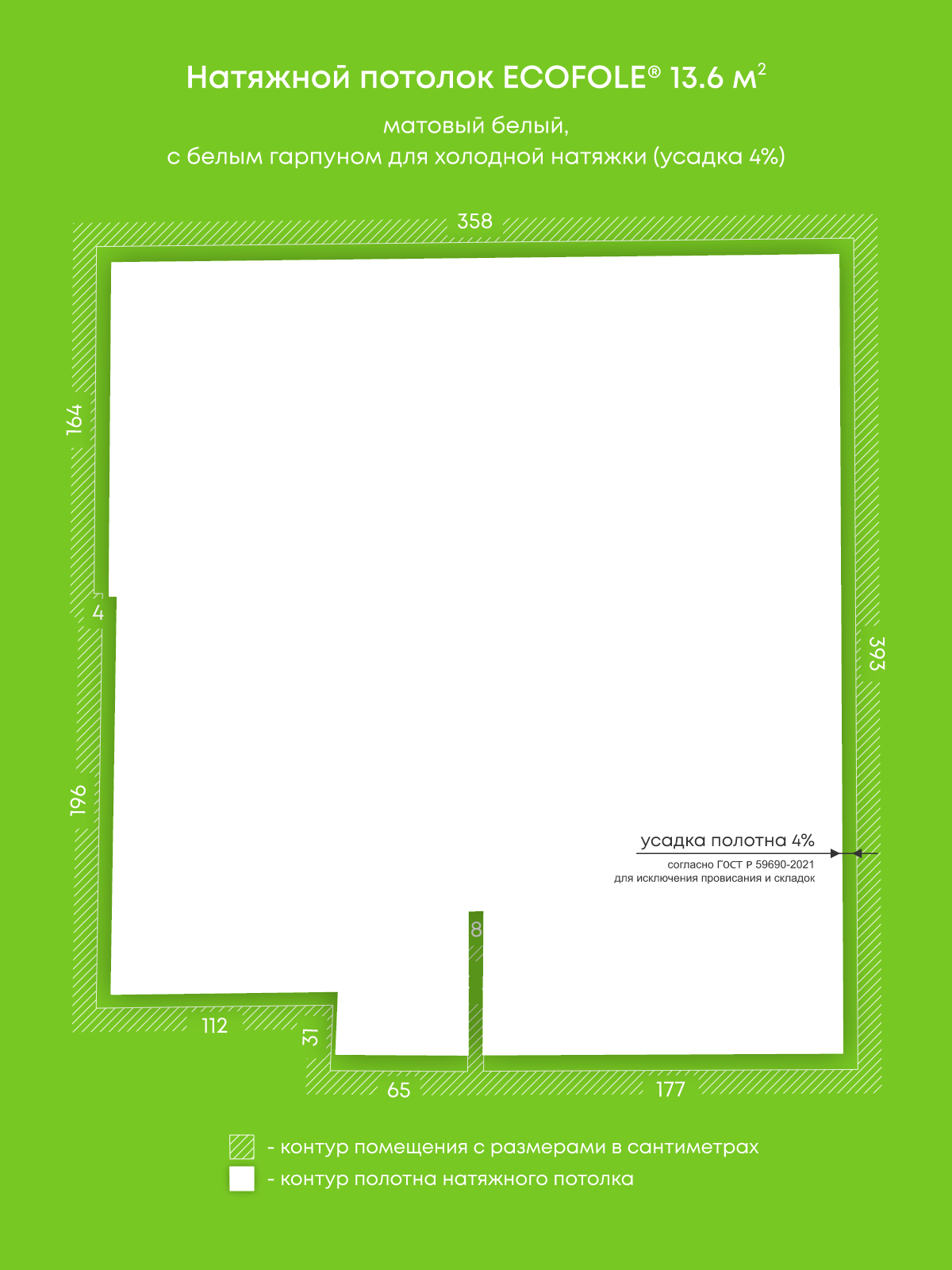 Натяжной потолок белый матовый, изготовленный по индивидуальным размерам покупателя, для гостиной площадью 13.6 м2