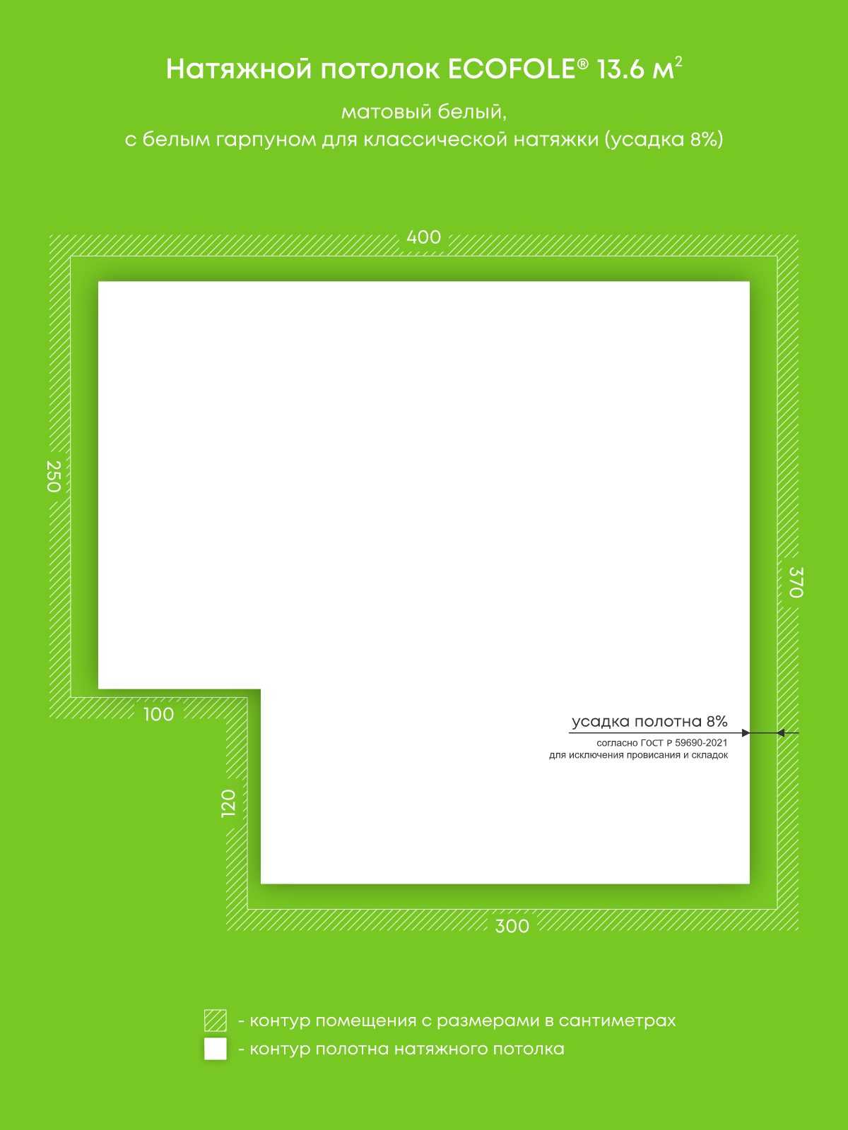 Натяжной потолок белый матовый, изготовленный по индивидуальным размерам покупателя, для гостиной площадью 13.6 м2