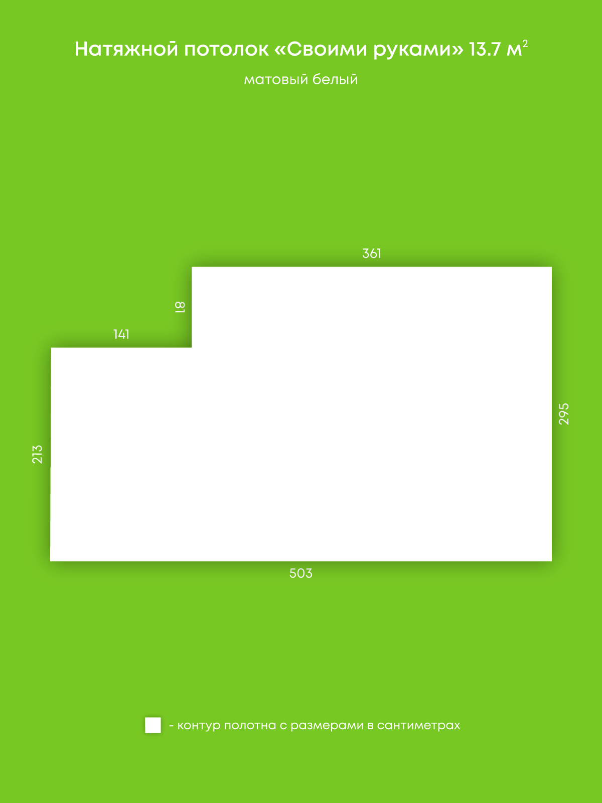 Натяжной потолок белый матовый, изготовленный по индивидуальным размерам покупателя, для помещения площадью 13.7 м2