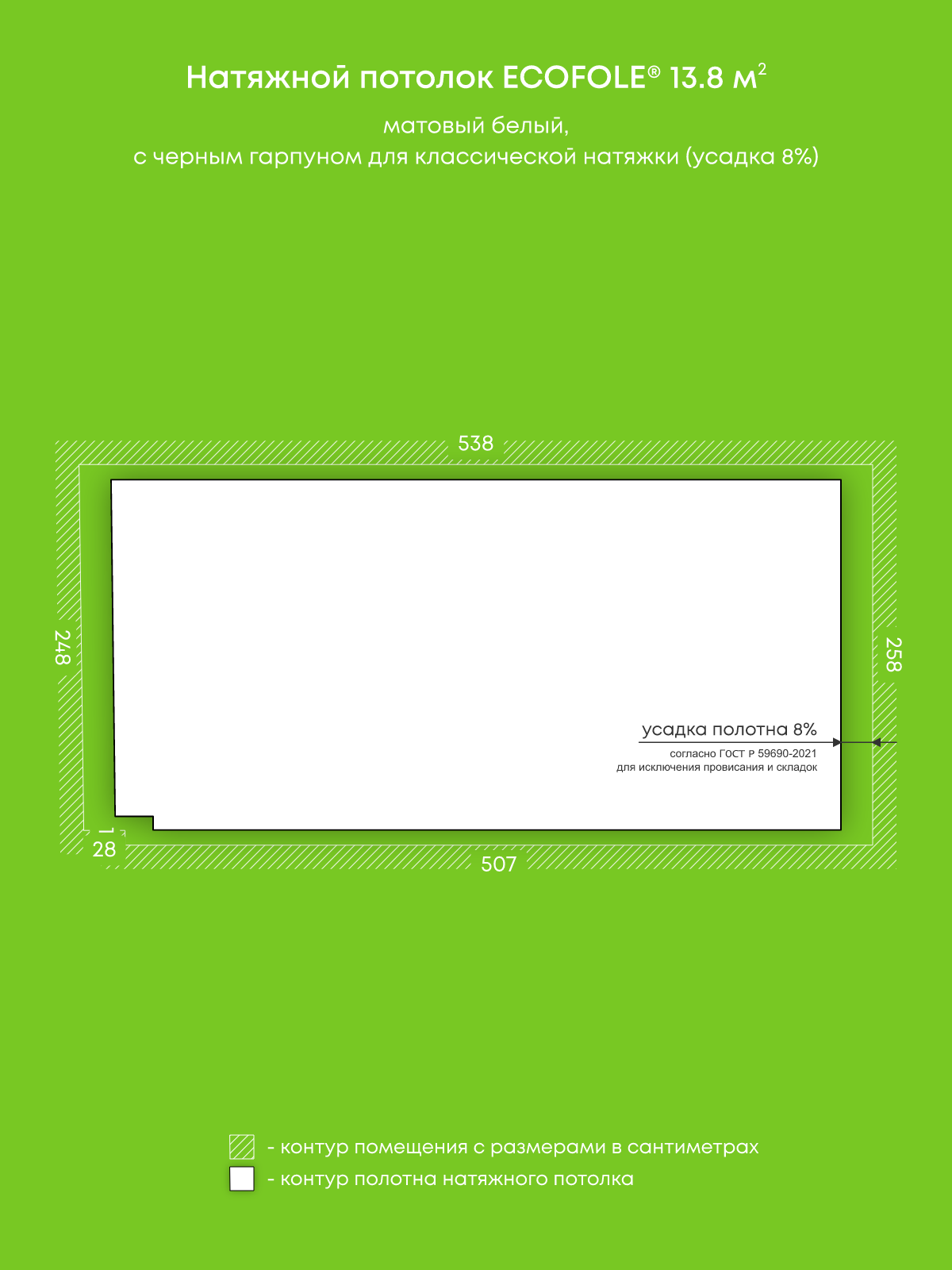 Натяжной потолок белый матовый, изготовленный по индивидуальным размерам покупателя, для помещения площадью 13.8 м2