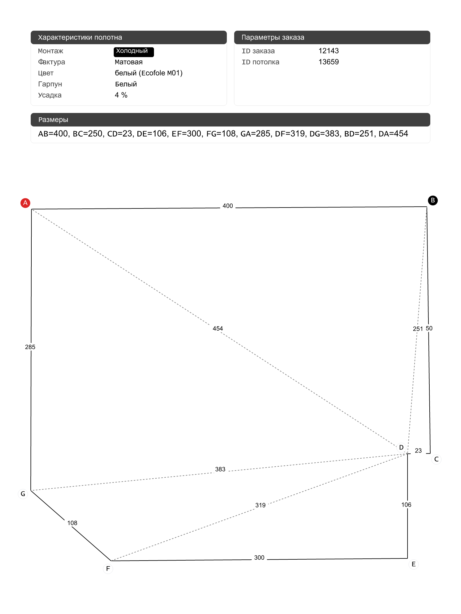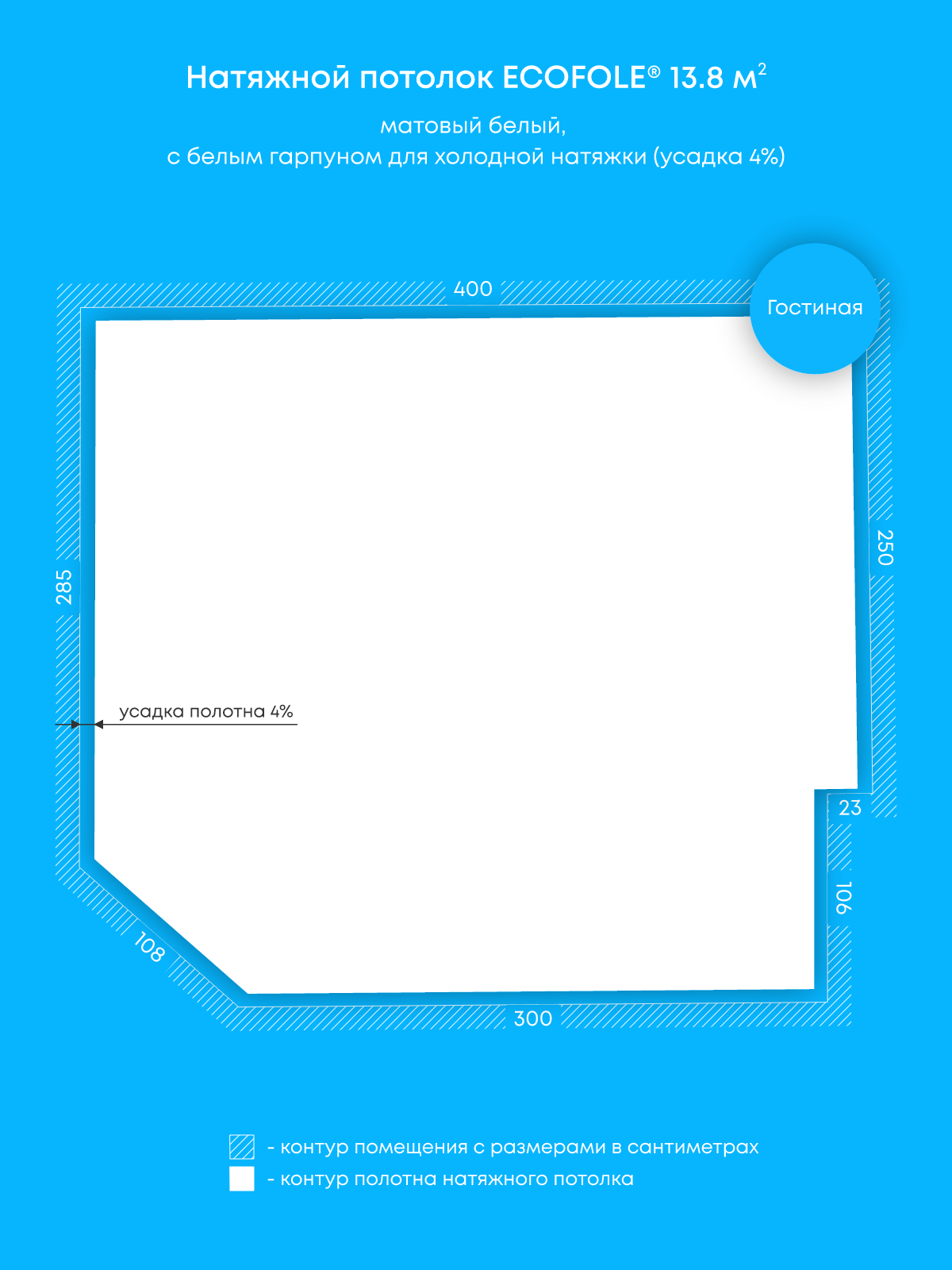 Натяжной потолок белый матовый, холодной натяжки, изготовленный по индивидуальным размерам покупателя, для помещения площадью 13.8 м2