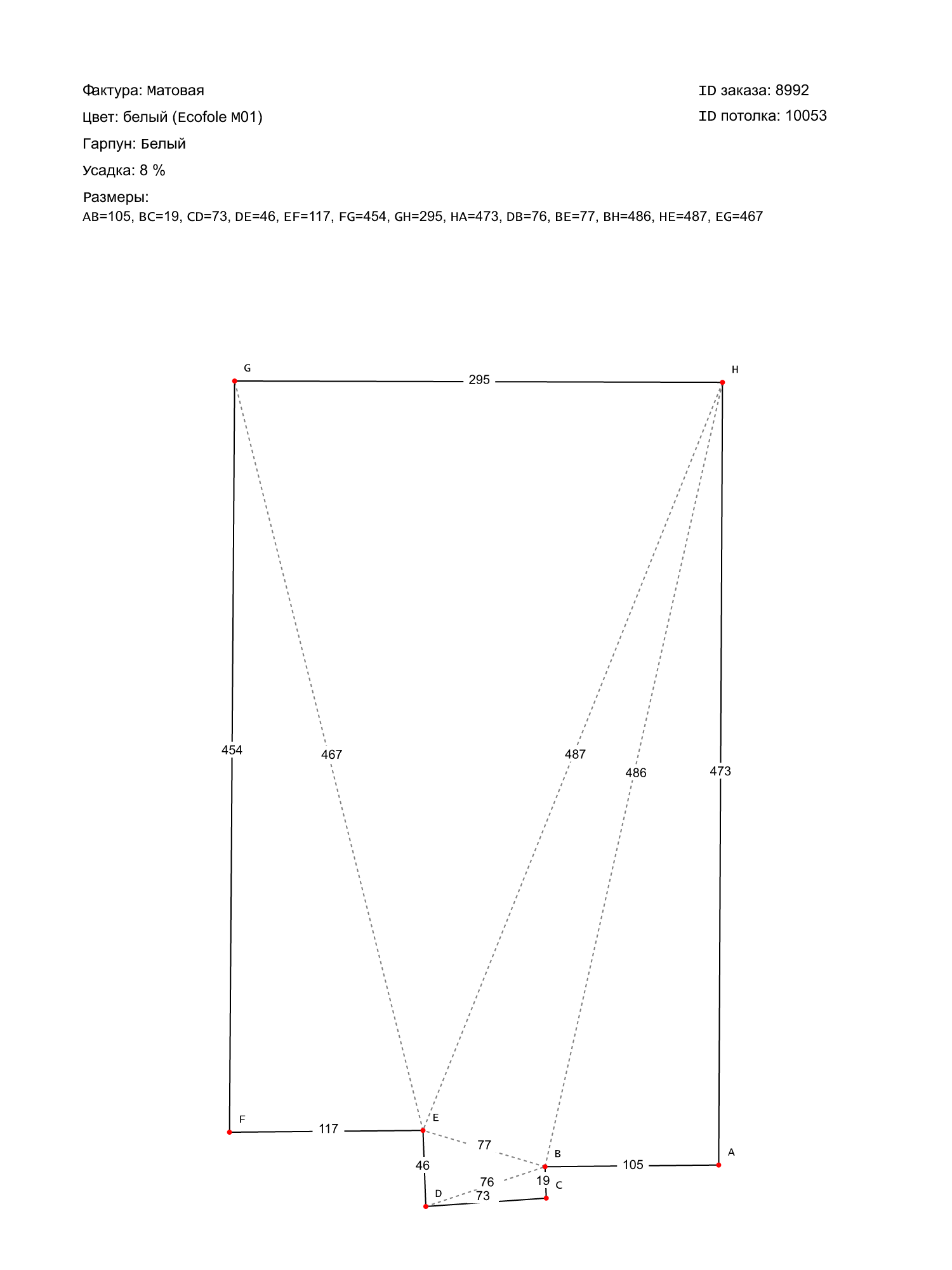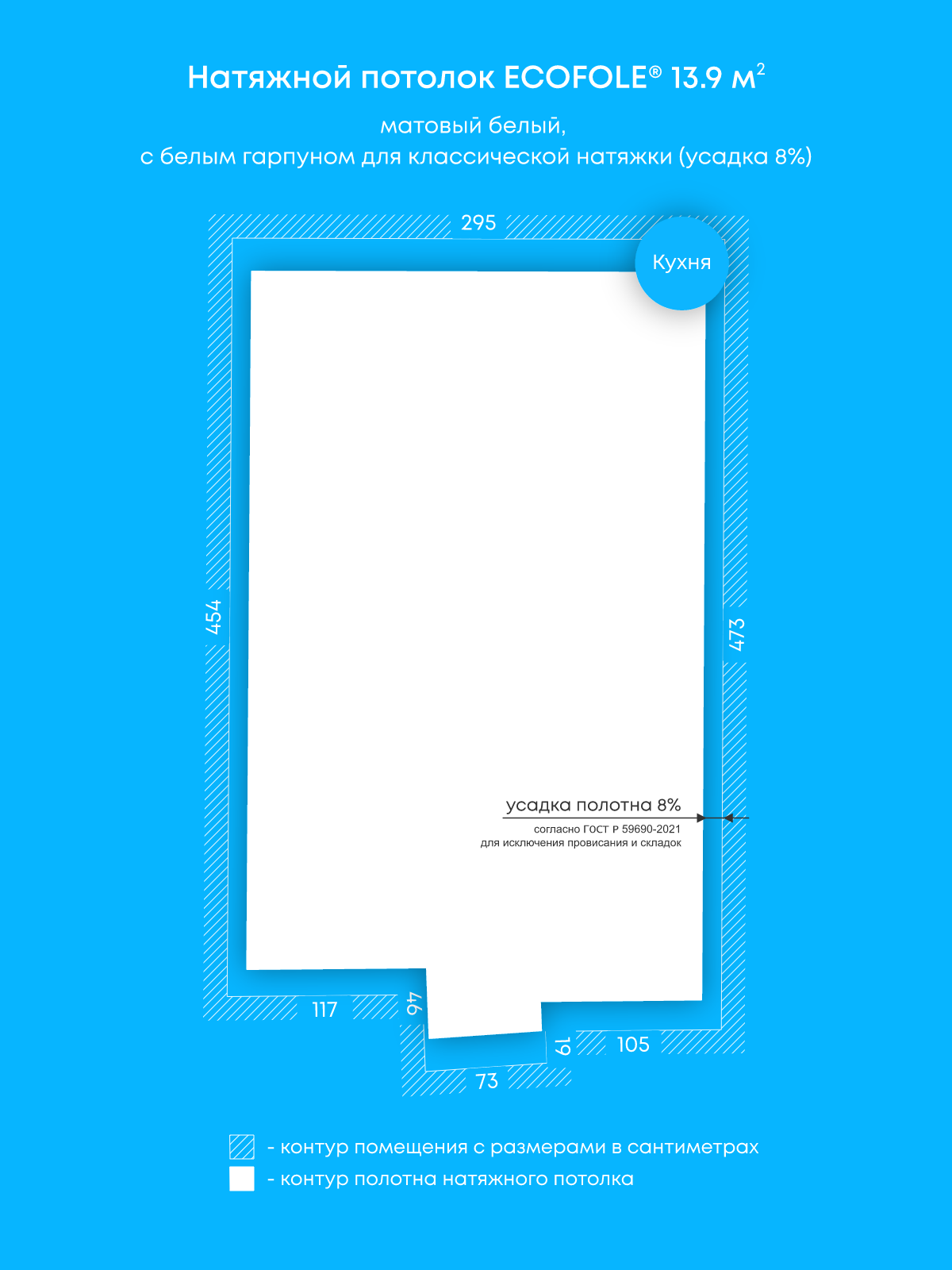 Натяжной потолок белый матовый, классической натяжки, изготовленный по индивидуальным размерам покупателя, для помещения площадью 13.9 м2