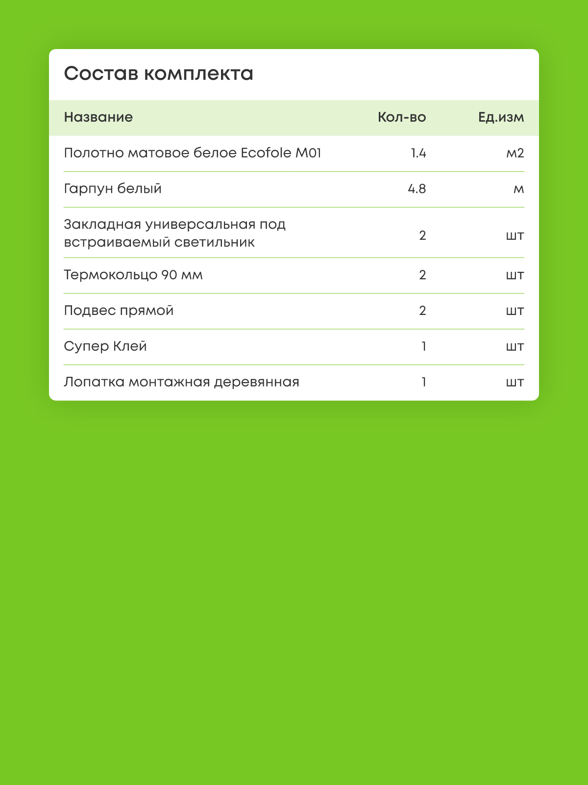 Натяжной потолок белый матовый, изготовленный по индивидуальным размерам покупателя, для помещения площадью 1.4 м2