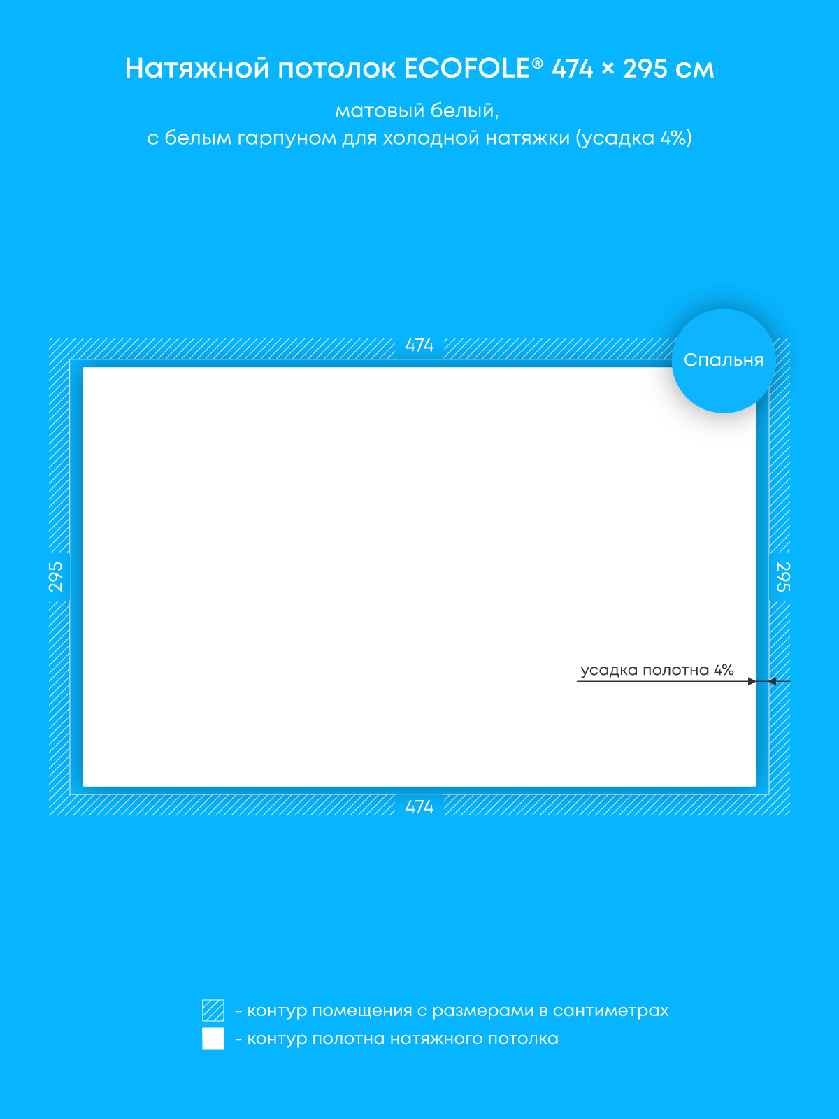 Натяжной потолок белый матовый, изготовленный по индивидуальным размерам покупателя, для спальни площадью 14 м2