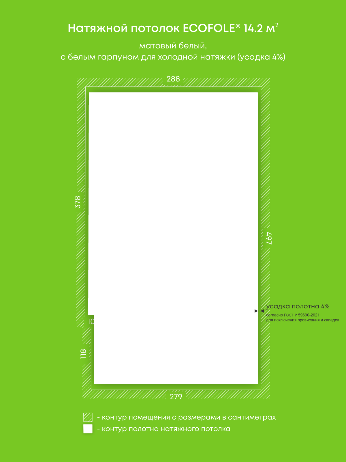 Натяжной потолок белый матовый, изготовленный по индивидуальным размерам покупателя, для гостиной площадью 14.2 м2