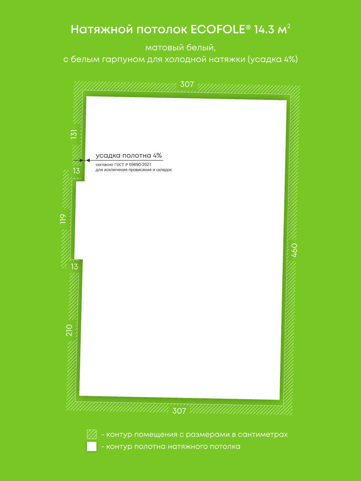 Натяжной потолок белый матовый, изготовленный по индивидуальным размерам покупателя, для комнаты площадью 14.3 м2