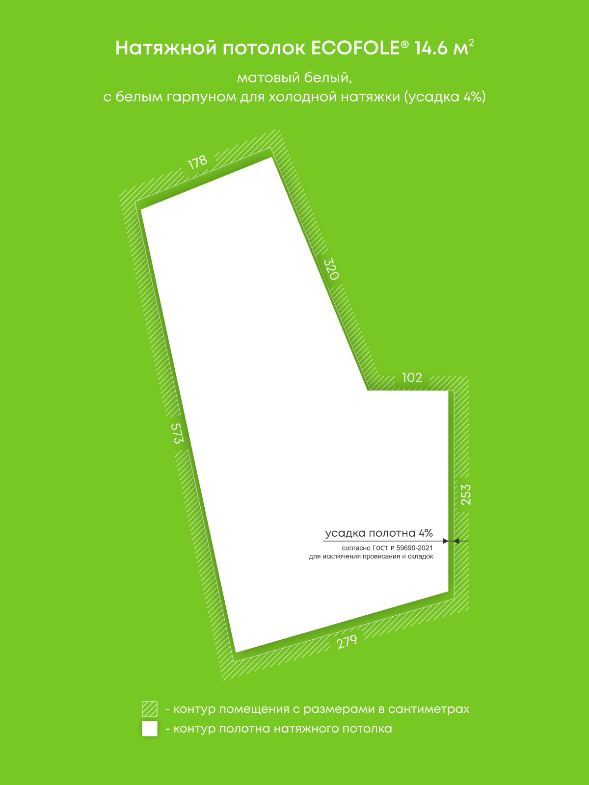 Натяжной потолок белый матовый, изготовленный по индивидуальным размерам покупателя, для комнаты площадью 14.6 м2