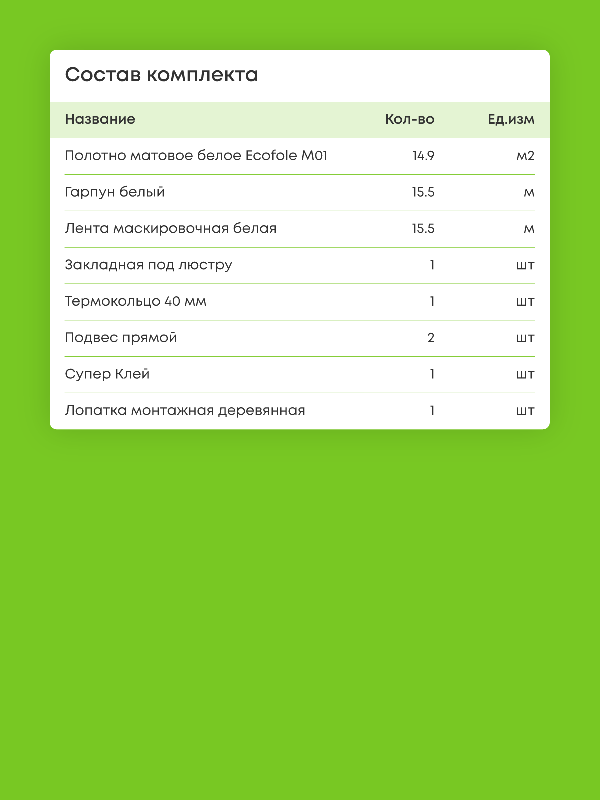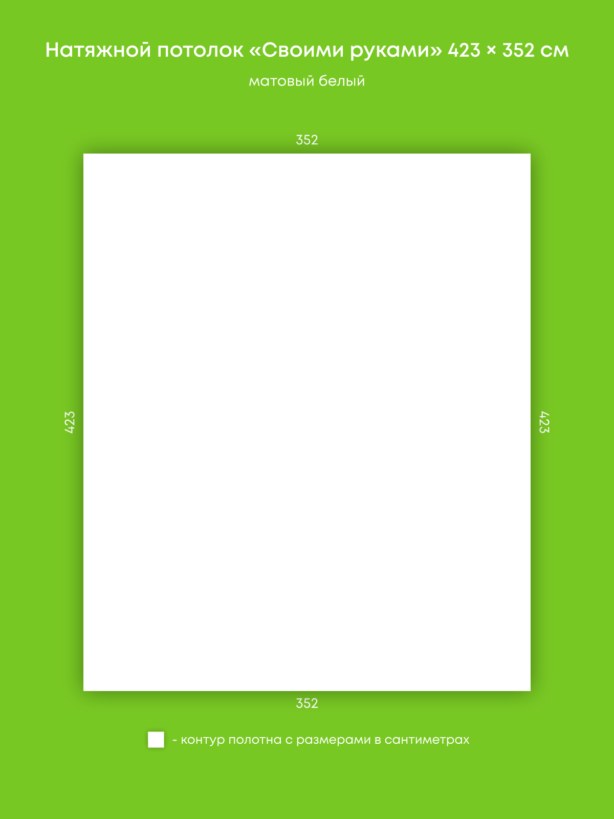 Натяжной потолок белый матовый, изготовленный по индивидуальным размерам покупателя, для помещения площадью 14.9 м2