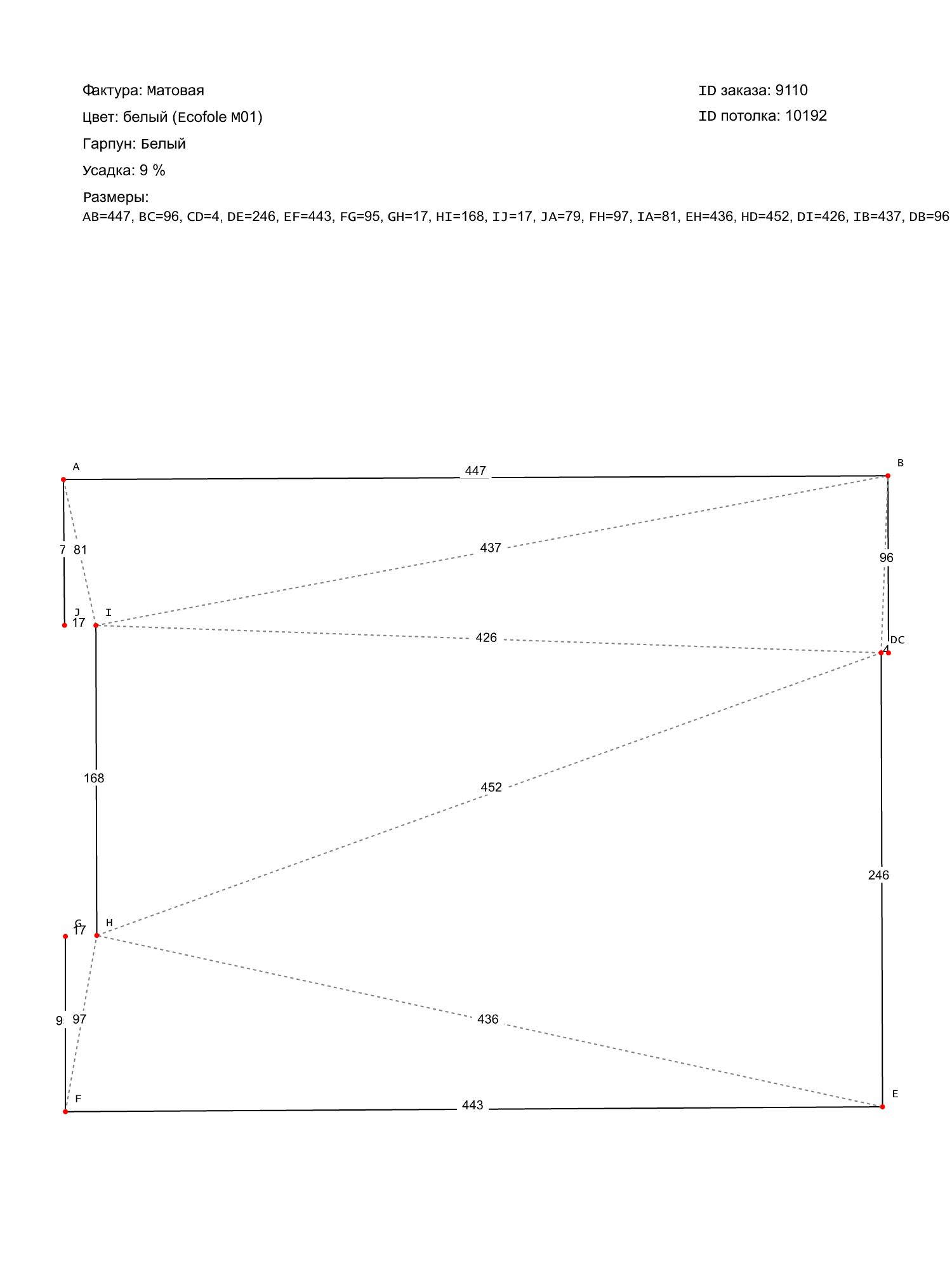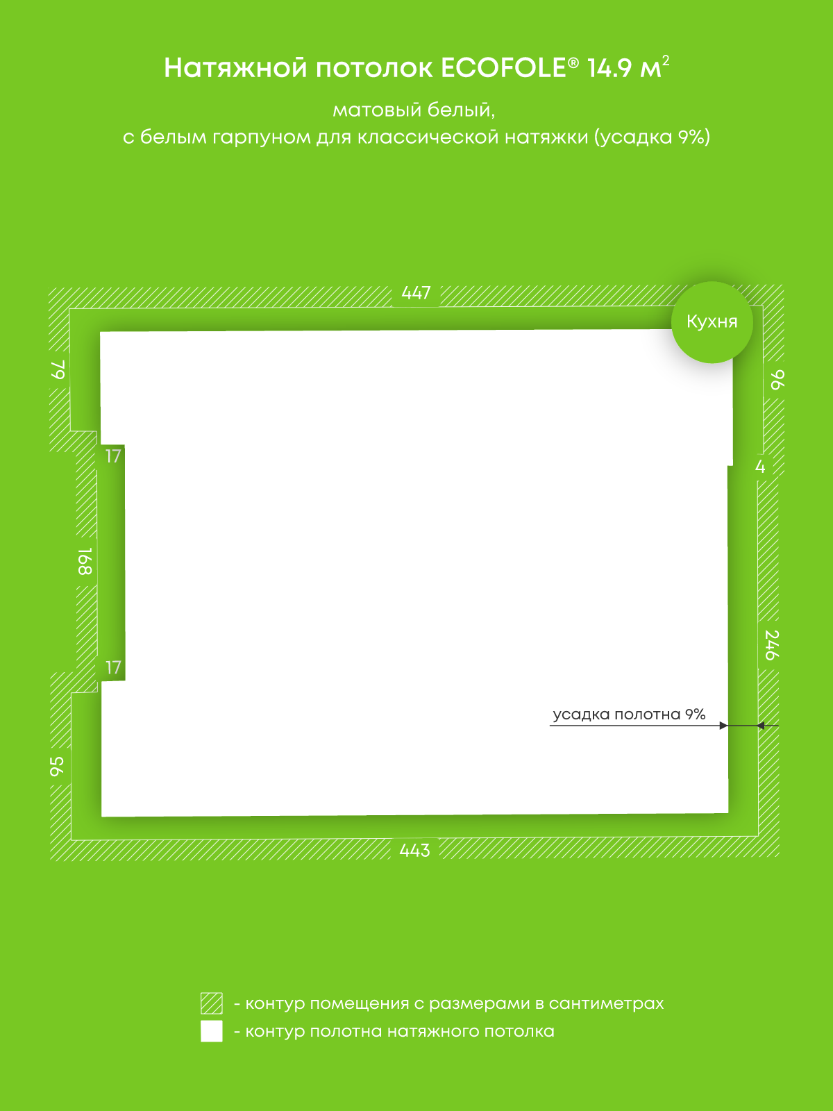 Натяжной потолок белый матовый, классической натяжки, изготовленный по индивидуальным размерам покупателя, для помещения площадью 14.9 м2