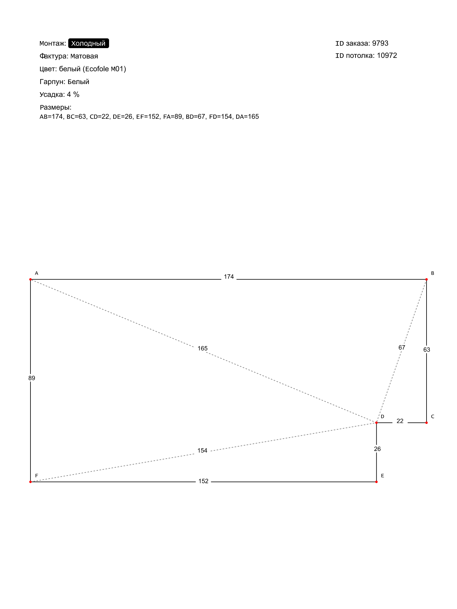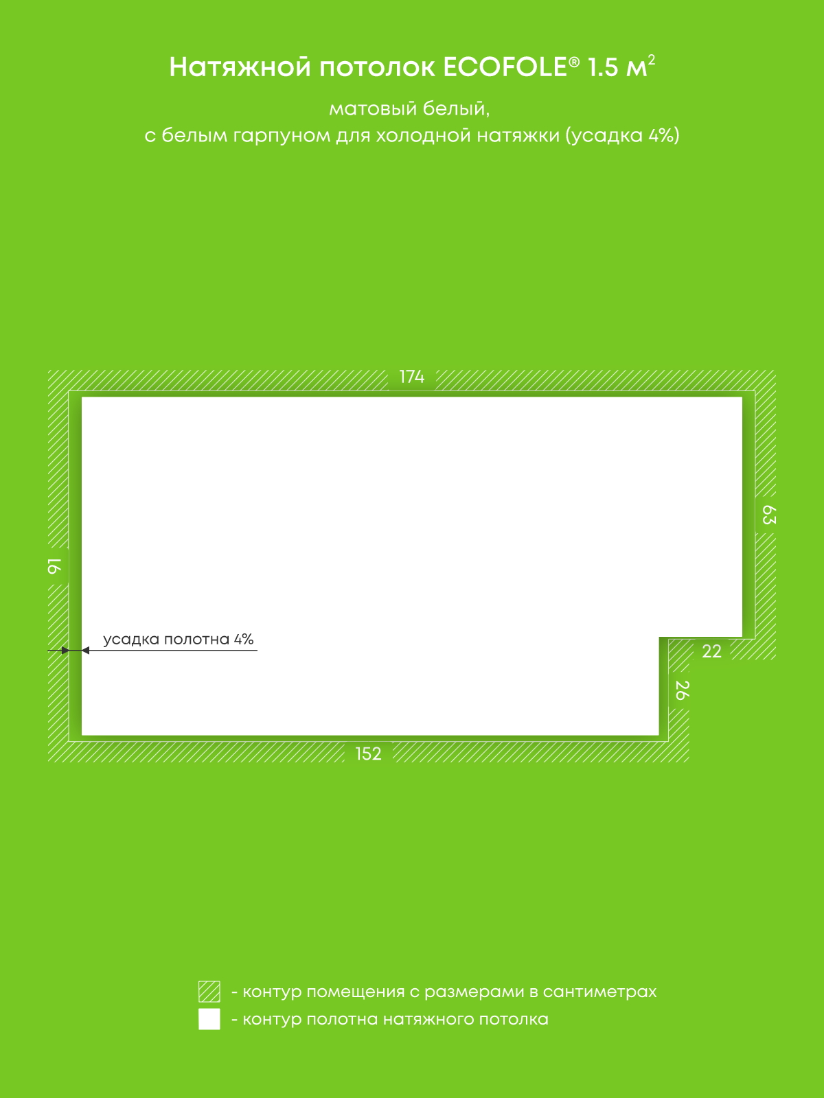 Натяжной потолок белый матовый, холодной натяжки, изготовленный по индивидуальным размерам покупателя, для помещения площадью 1.5 м2
