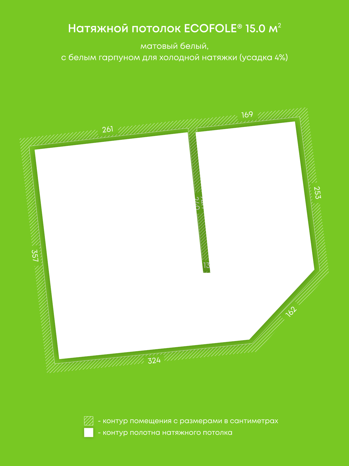 Натяжной потолок белый матовый, изготовленный по индивидуальным размерам покупателя, для кухни площадью 15 м2