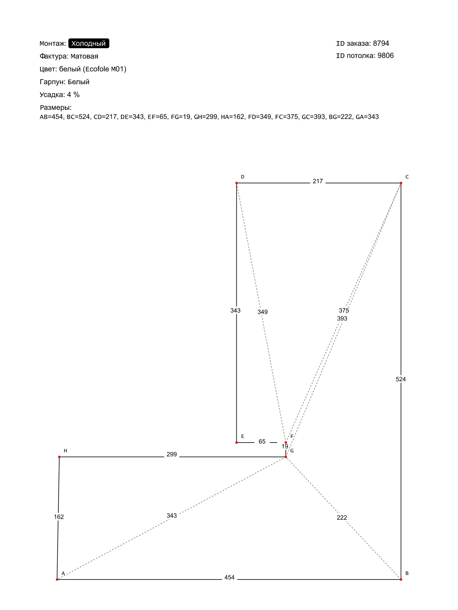 Натяжной потолок белый матовый, холодной натяжки, изготовленный по индивидуальным размерам покупателя, для помещения площадью 15.1 м2