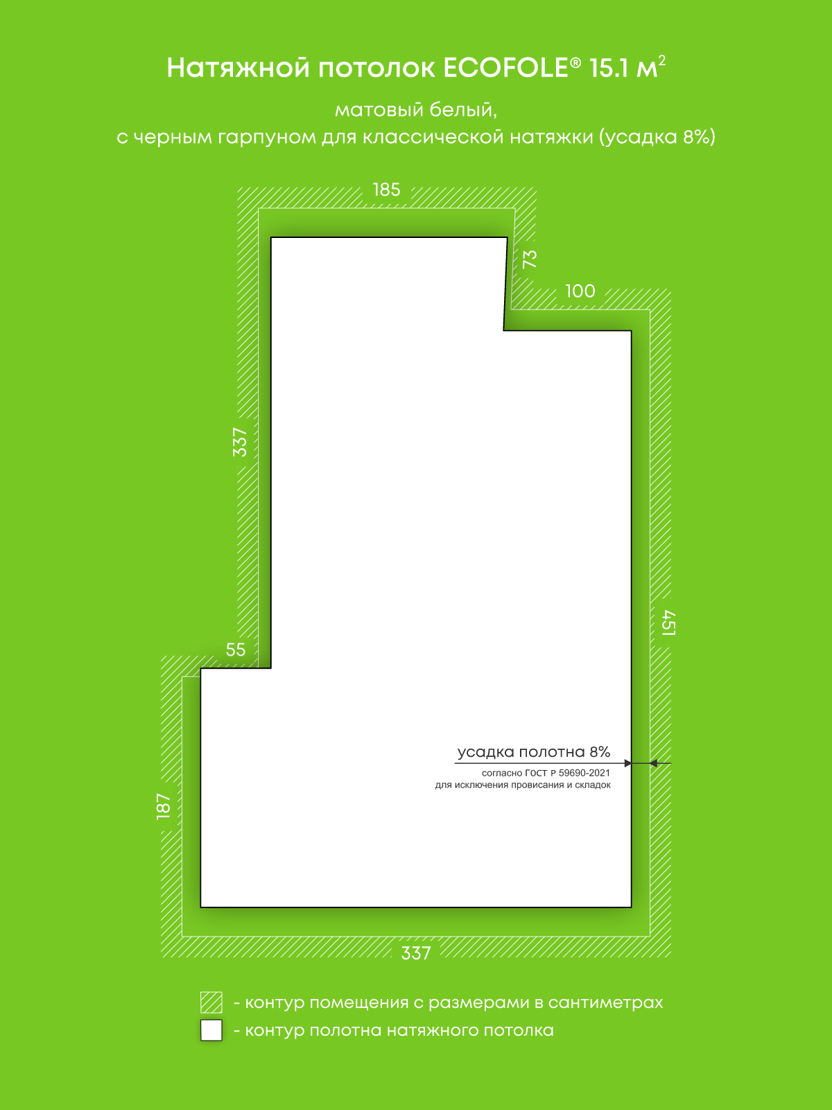 Натяжной потолок белый матовый, изготовленный по индивидуальным размерам покупателя, для гостиной площадью 15.1 м2