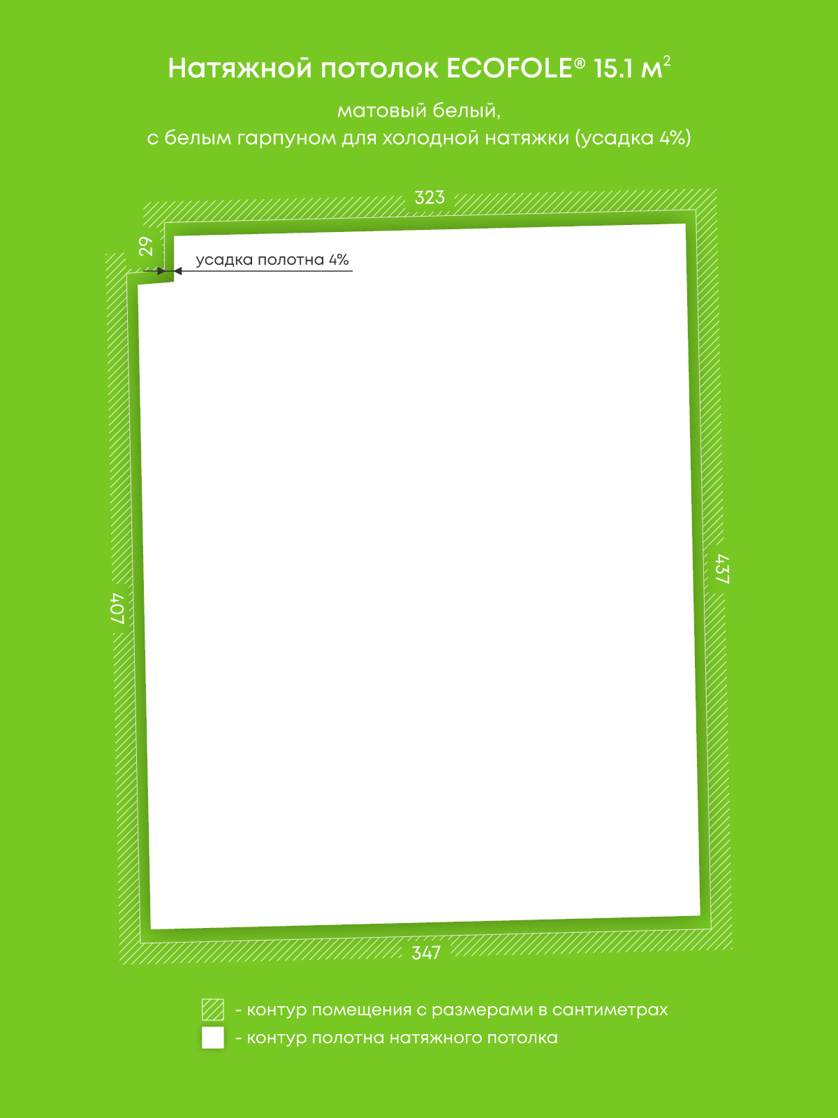 Натяжной потолок белый матовый, изготовленный по индивидуальным размерам покупателя, для спальни площадью 15.1 м2